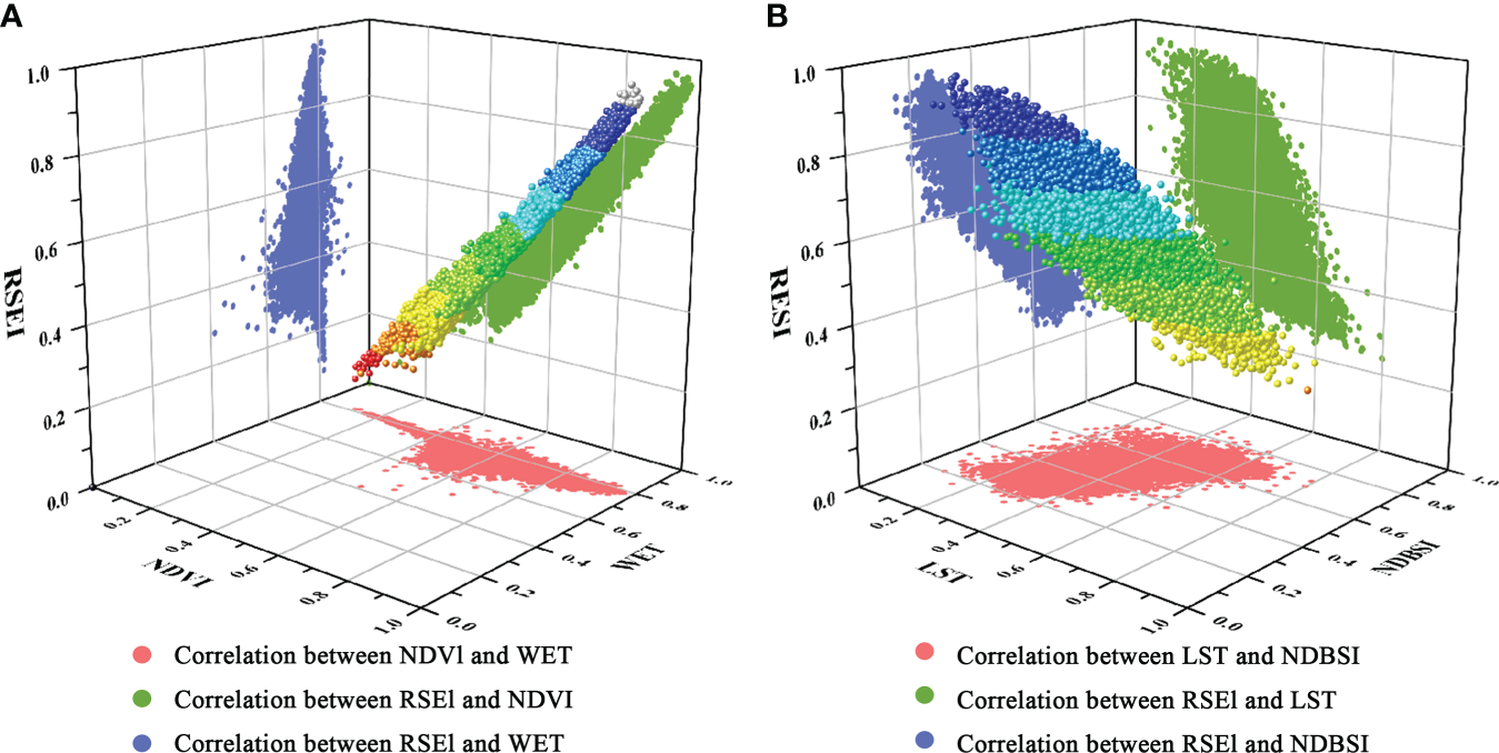 All raster data were resampled to 1 km × 1 km, then the NDVI, WET and RSEI were projected into a three-dimensional space together (Figure 10A), as were LST, NDBSI and RSEI (Figure 10B). Figure 10 shows that the RSEI increased with NDVI and WET, so RSEI is positively related to greenness and humidity, which is consistent with our own observations and other studies (Xiong et al., 2021). The RSEI decreased as LST and NDBSI increased, indicating that RSEI is negatively correlated with heat and dryness, which is also consistent with the actual situation and the results of Yao et al. (2022).
