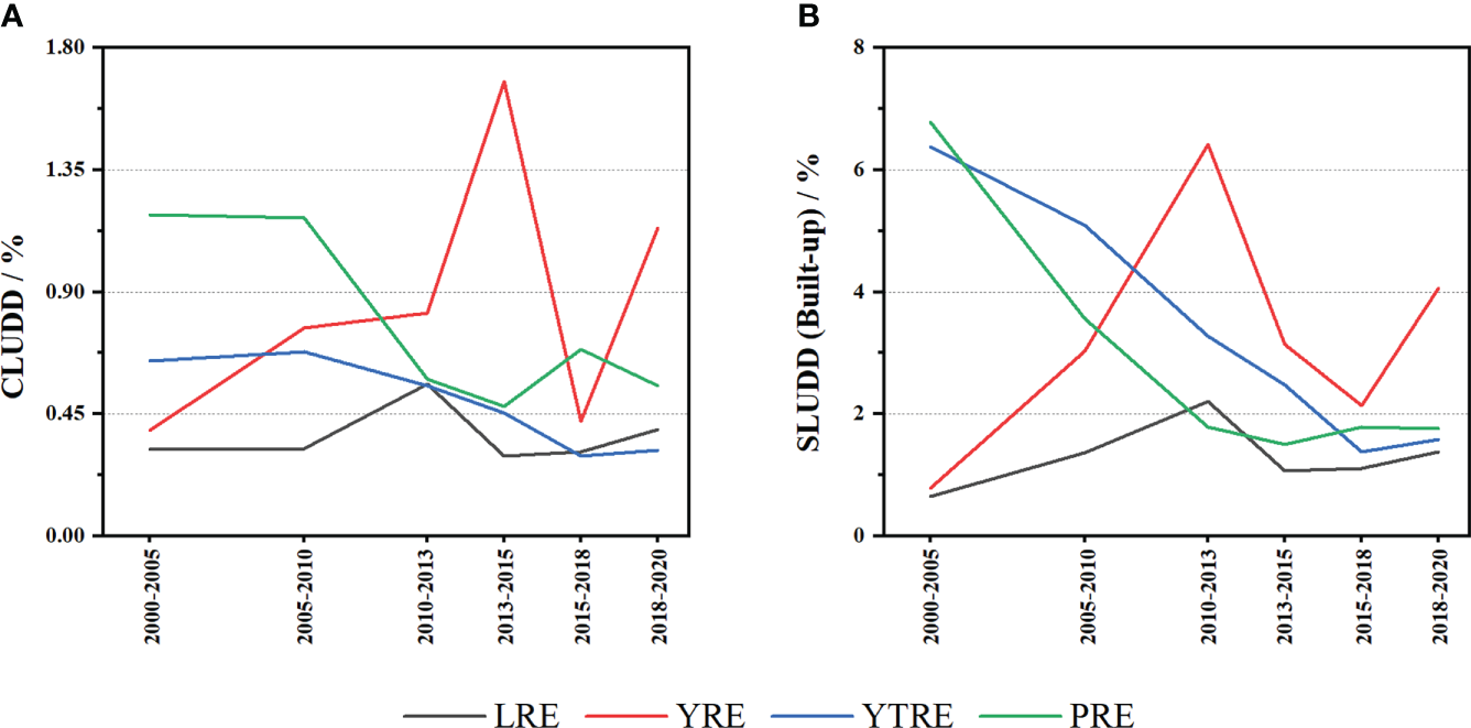 where ΔLUij is the area of class i land transferred to class j land during the study period, and LUi is the initial area of type i land. In this study, i is built-up land, j is other land-use types, and n is the number of land use types (Huang et al., 2018).