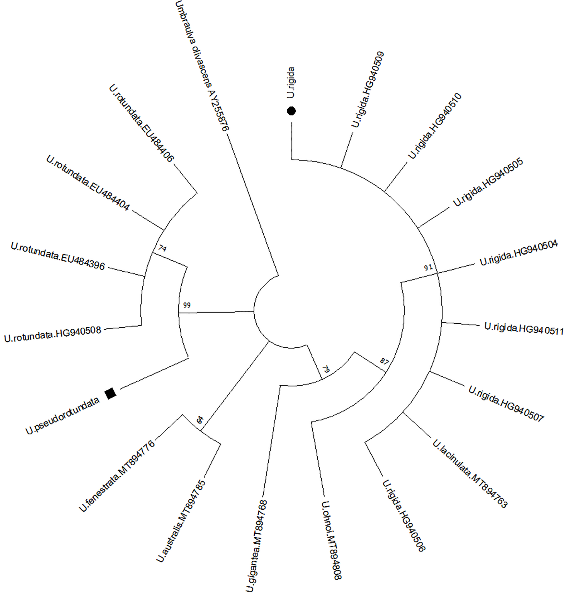 Ulva species identification utilized in this study. Molecular identification of algal material, considering a phylogenetic tree obtained by RbcL sequences (SHF1 and SHR4 markers). ⬛U. pseudorotundata; ⚫U. rigida.