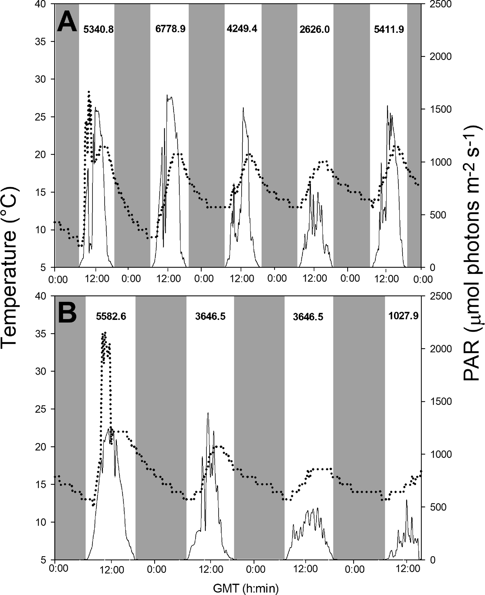 Variation in temperature (°C, dotted line) and photosynthetically active radiation (PAR, µmol photons m-2 s-1, solid line) data during the experimental cultivation period of U. pseudorotundata and U. rigida in fish effluents. (A) daily temperature and daily solar irradiance for experiment 1 (50% fish effluent) and (B) daily temperature and daily solar irradiance for experiment 2 (100% fish effluent). PAR: λ = 400-700 nm. Gray areas correspond to dark periods. The integrated daily irradiance values (kJ m-2) are displayed at the top of the graphs.