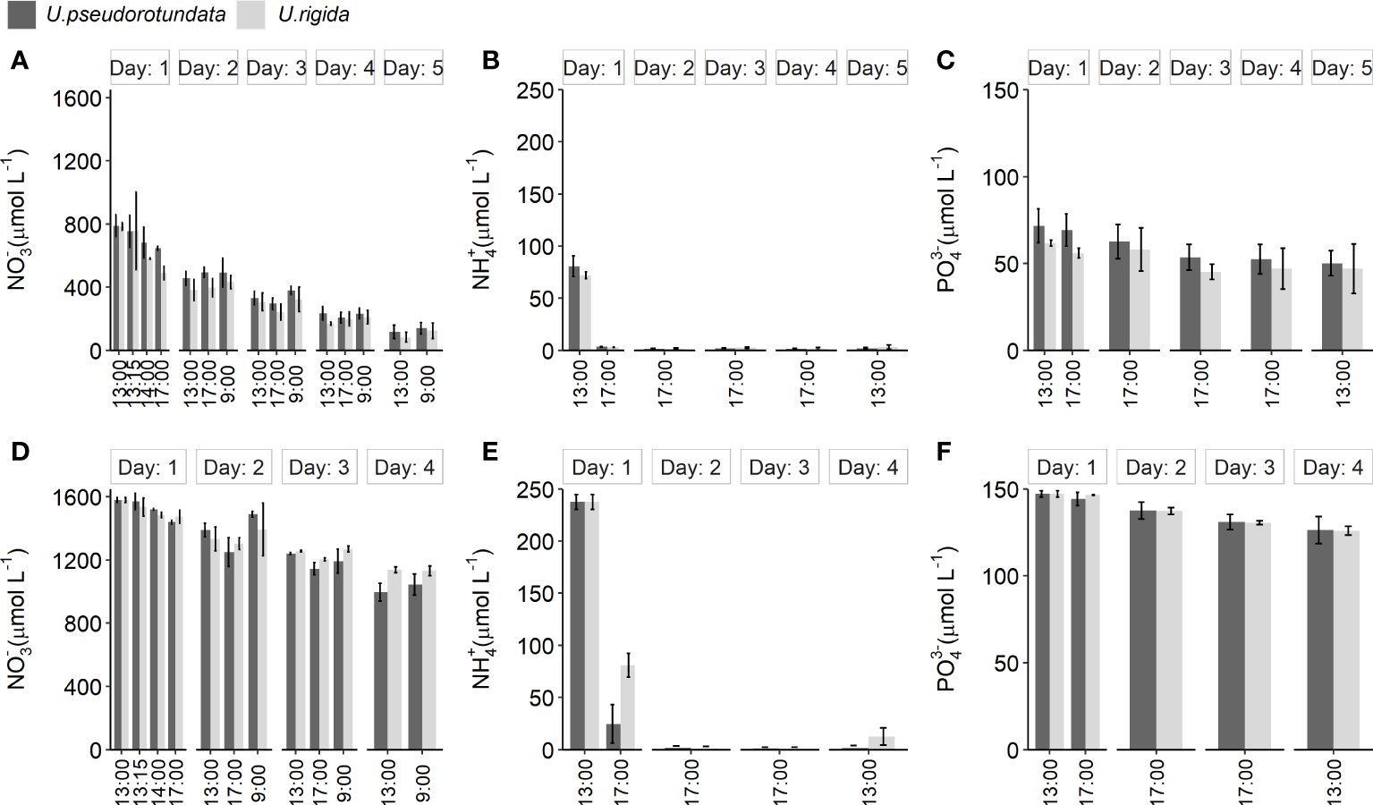 Changes in concentrations of NO3-, NH4+, and PO43- (µmol L-1) during the experimental cultivation of U. pseudorotundata and U. rigida.(A–C) refer to experiment 1, conducted during 5 days with 50% fish effluent. (D–F) refer to experiment 2, conducted during 4 days with 100% fish effluent. Values are mean ± SD, n = 3.