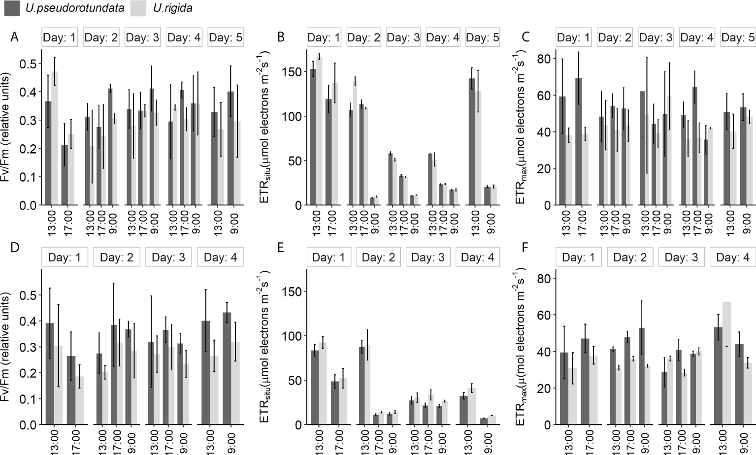 Diurnal changes of photosynthetic parameters: maximum quantum yield (Fv/Fm), in situ electron transport rate (ETRsitu), and maximum electron transport rate (ETRmax) of U. pseudorotundata and U. rigida in two conditions: 50% fish effluent (5 days): (A–C); 100% fish effluent (4 days): (D–F). Values are mean ± SD, n = 3.