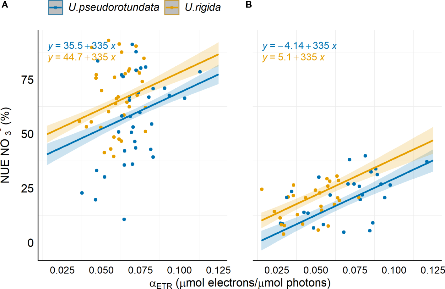 Linear regression model between NO3- uptake efficiency (NUE) and photosynthetic efficiency (αETR) for the species U. pseudorotundata and U. rigida grown in (A) 50% fish farm effluent and (B) 100% fish farm effluent. The solid line represents the fitted values of the overall model.