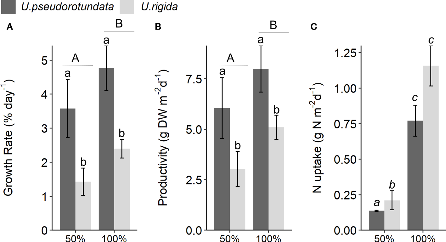 (A) Growth rate (% day-1), (B) productivity (g DW m-2 d-1), and (C) nitrogen uptake (g N m−2 day−1) of U. pseudorotundata and U. rigida grown in 50% and 100% fish farm effluents. Values are mean ± SD, n = 3. Different small letters represent differences related to the factor “species”. Different capital letters represent differences caused by the factor “effluent concentration”. Different italic letters represent the differences caused by the interaction between the two factors.