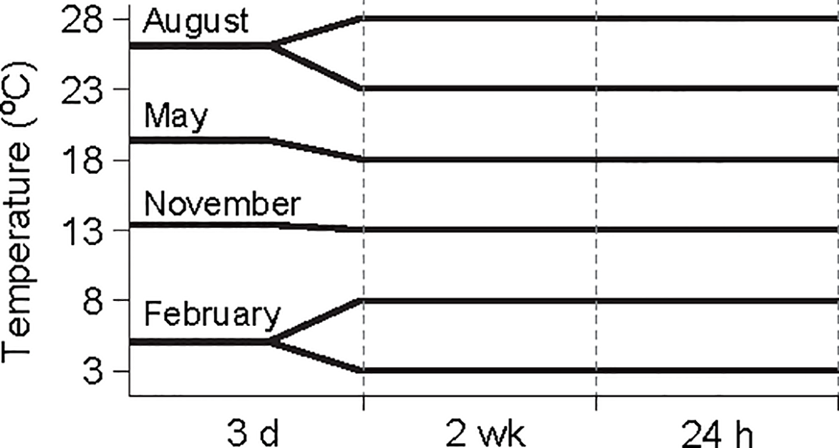 Experimental design and water temperature regimes in different seasons. Water temperatures were adjusted to 3°C and 8°C for February conditions to test the effect of winter warming on physiological activities in Anadara kagoshimensis, and 23°C and 28°C for August conditions to test the effect of summer warming. 13°C and 18°C represent November (autumn) and May (spring) conditions.