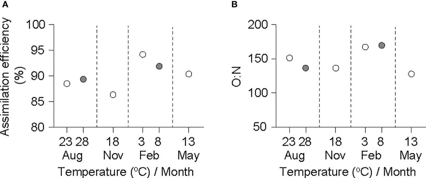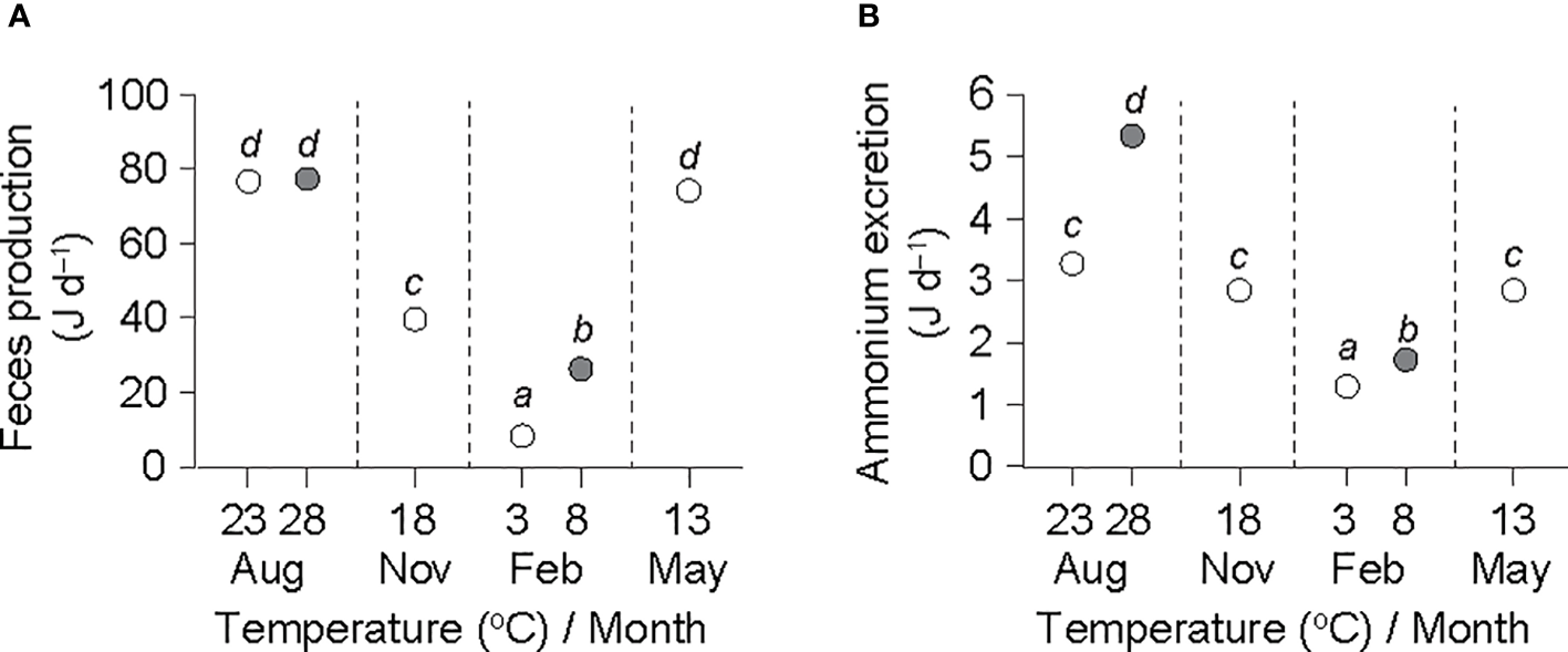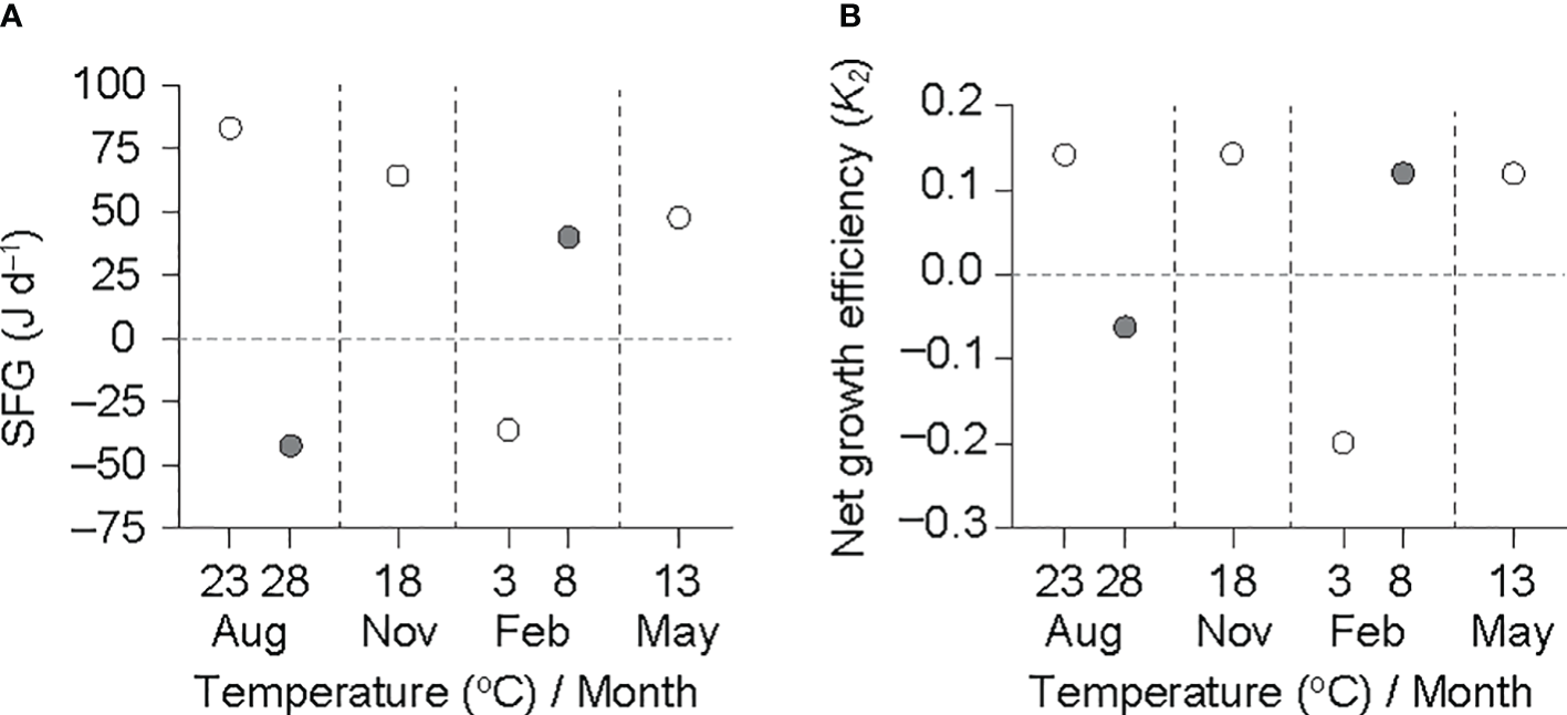 The present study aimed to measure the seasonal variation of the physiological components (e.g., ingestion, egestion, excretion, and respiration) of energy balance in A. kagoshimensis, examine its physiological adjustment processes under a wide thermal range, and estimate SFG to evaluate its capacity of net production. Specifically, we tested (1) the effect of rising minimum temperature on winter energy dynamism, which would be responsible for the advancement of the accumulation of energy reserves in spring and, thus, the reproductive phenology of this species; and (2) the effect of an extremely high temperature on summer energy dynamism, which would determine the recovery of the somatic condition after spawning, with a particular emphasis on their physiological responses to changes in thermal regimes. Our final goal was to highlight the manner in which the recent warming of this sea area (which is changing the thermal regime) affects the seasonal energy dynamism that supports the growth performance of this clam species. Our hypothesis was that physiological responses of the clam to winter and summer warming would alter their seasonal energy dynamism and finally patterns in fitness.