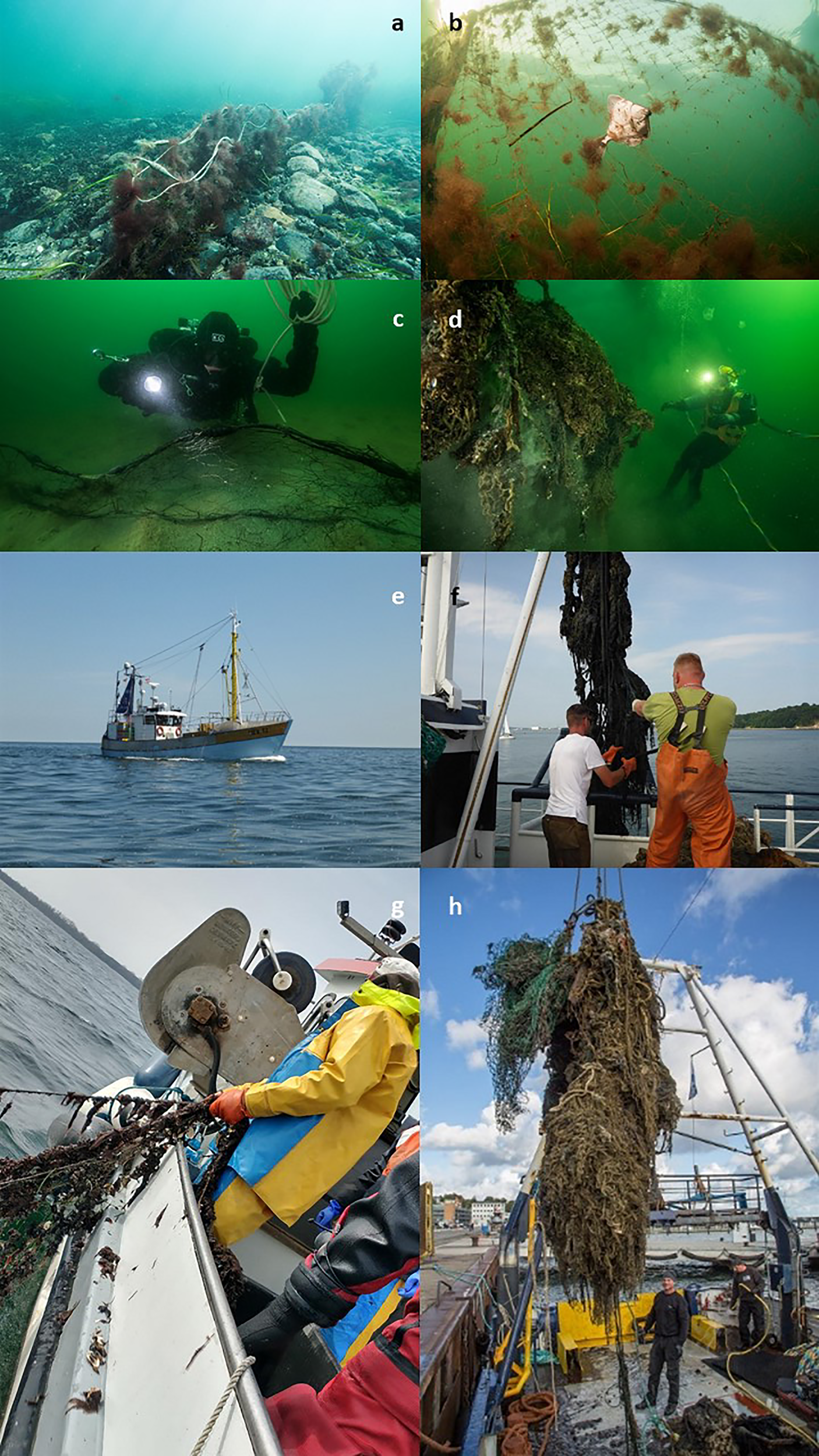 Impressions of WWF Germany’s ghost gear project: (A) lost gillnet on the seafloor near Rostock still catching fish and seabirds (© Martin Siegel, WWF); (B) same gillnet ghost fishing for several months before its dicsovery with numerous plaice and two cormorants (© Wolf Wichmann, WWF); (C) diver verifying a sonar position to be a lost gillnet corresponding to Figure 2B (© Christian Howe, WWF); (D) professional diver retrieval of a trawl bundle mixed with other nets and litter (© Christian Howe, WWF); (E) the “UEK 12 Bergen” - typical Baltic Sea 17m fishing vessel used for pair trawls – and ghost gear retrievals (© Andrea Stolte, WWF); (F) fishers working hard on vessel “SAS 107 Crampas” to get sonar-identified lost gear on board (© Andrea Stolte, WWF); (G) gillnet retrieval in Wismar Bay with a 9m gillnetter (© Andrea Stolte, WWF); (H) retrieved trawl bundle during removal from the working vessel “Fritz Reuter” with a heavy lifting crane (© Christian Howe, WWF).