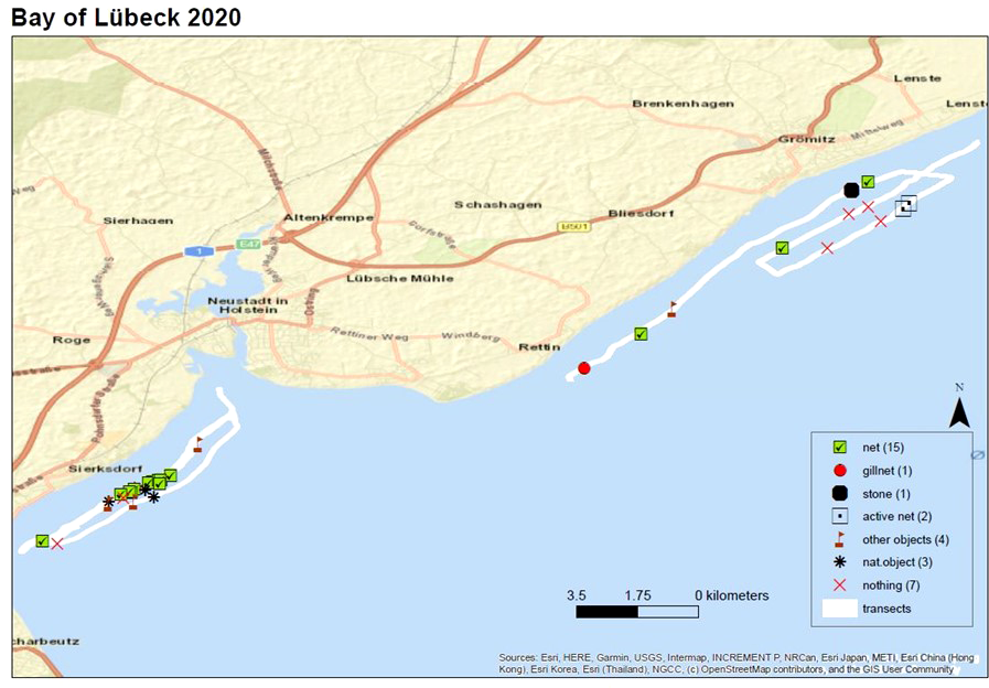 Test area in the Bay of Lübeck, with analysis of sonar supect positions, annotated with type of objects found at each suspect location. Sonar charting of 3 days led to 49 suspect positions in this test area, of which 22 were confirmed as lost gear or ropes on 5 scientific diving days. All 22 ALDFG could be retrieved on 9 days of recovery operations. © Jutta Beher, WWF.