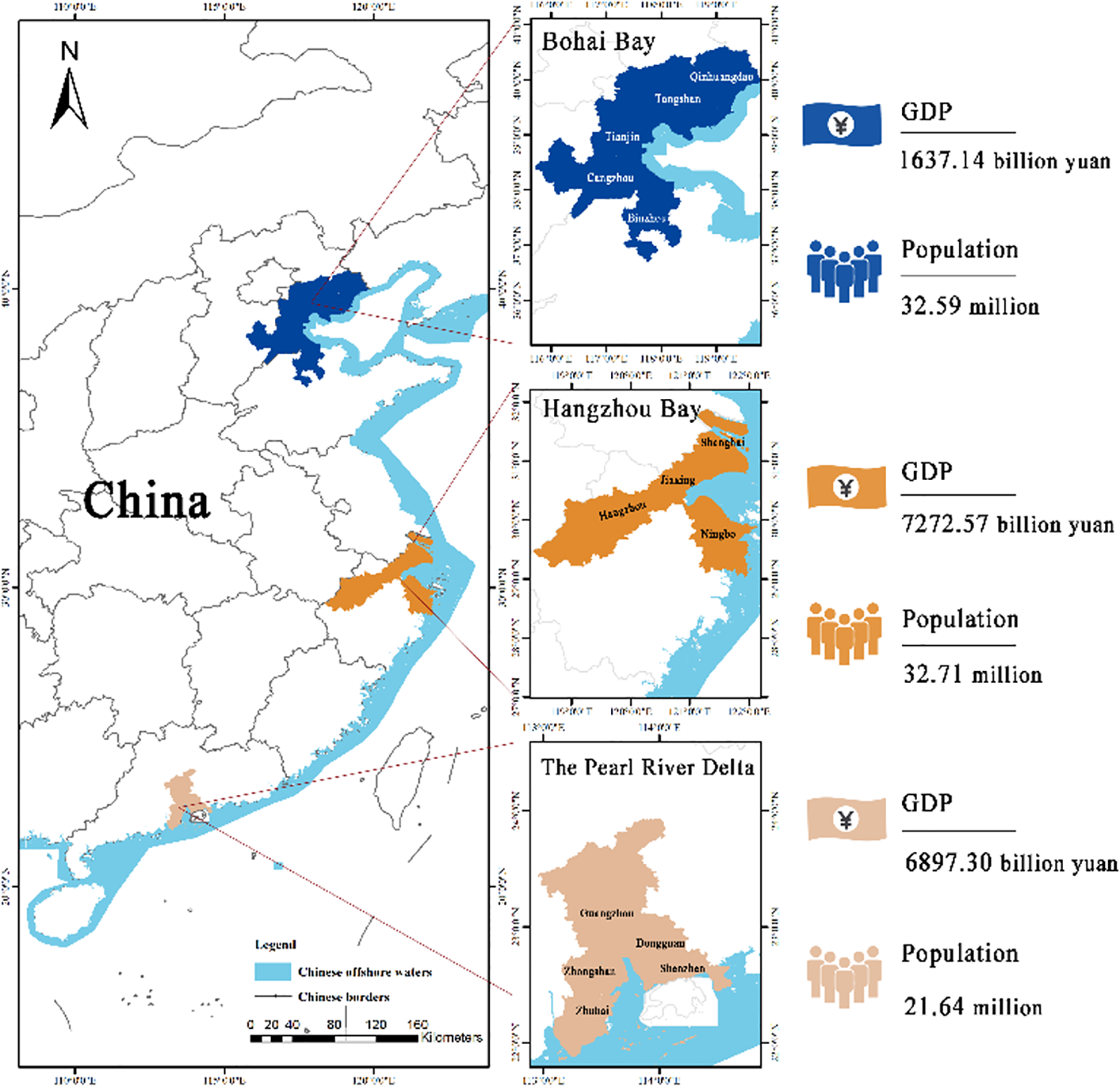 Location of Bohai Bay, Hangzhou Bay, and the Pearl River Delta in China. GDP and population are counted in 2020.