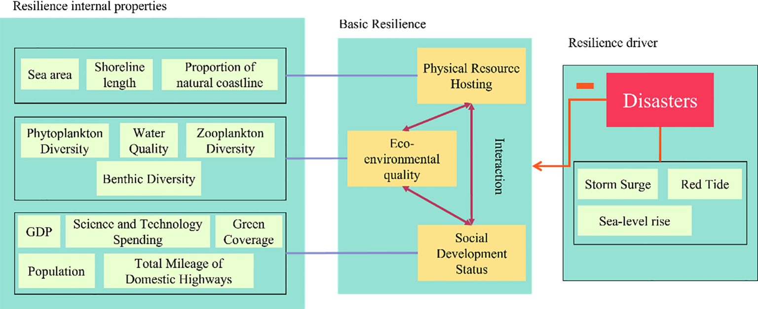 Resilience is the ability of a system to adapt, overcome external disturbances, maintain its own stability, and restore its own function through a series of processes such as “resistance, absorption, repair, enhancement, and learning” (Adger et al., 2005). Resource depletion and potential environmental damage have triggered considerable concern about introducing resilience theory into regional management framework to achieve sustainable development (Brand, 2009; Yang et al., 2018). The resilience concept is permeating policymaking, for example, the National Science & Technology Council (NSTC) of the US published the “Opportunities and Actions for Ocean Science and Technology 2022–2028,” which encouraged the development of key elements for building resilient coastal communities, such as knowledge, technology, and capital (NSTC, 2022). Moreover, China has included the concept of urban resilience in the 14th Five-Year Plan and outline of long-term goals for 2035. However, even if increasing academic research and debates have discussed resilience management from multiple perspectives, there still a lack of comprehensive general discussions on evaluation strategies in this new and growing field (Li et al., 2020; Liu et al., 2022). A critical but largely inadequate need for resilience management is scientific information (Brown and Williams, 2015). Thus, government occupies the primary position in promoting resilience development systemically through public policies. For practical policy guidance, understanding the overall character of the systemic resilience based on quantifying interactions of impact factors within the system would facilitate better results (Nathwani et al., 2019). Since resilient development of the coastal zone requires consideration of the nexus between the land and sea, it is difficult to process in coastal areas.