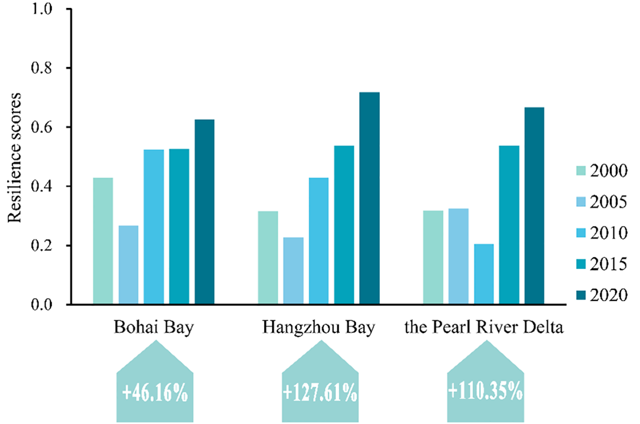 Changes in the three bays’ resilience scores by regions from 2000 to 2020. The percentage below it shows that the change rate in the resilience scores from 2000 to 2020 HZB and PRD have higher increasing rates of the resilience score than BHB.