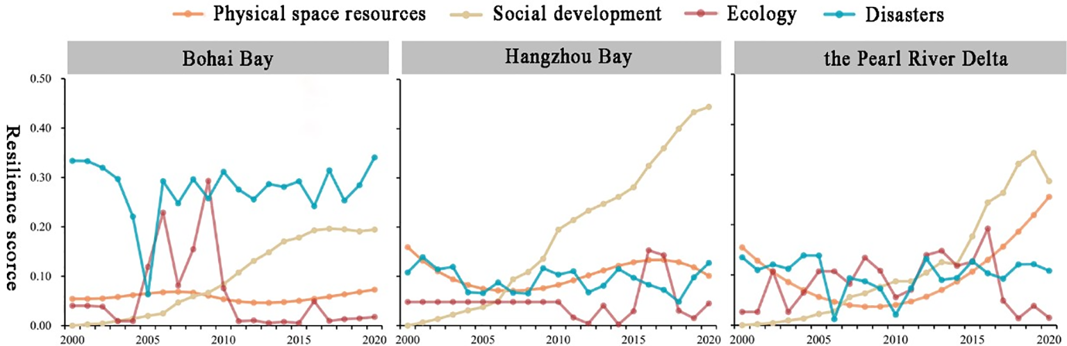 Regarding physical space resources resilience, the resilient level in BHB was relatively stable and increased slightly, and the resilience level dropped first then grew and ultimately dropped in HZB, and the resilient level dropped first then grew and ultimately grew in PRD. The resilient level of physical space resources developed in a differentiated manner among different regions, which resulted from local disparities in socioeconomic status, policies, technology, and so on. The resilient level of social development showed a rapid upward trend in the three bay areas.