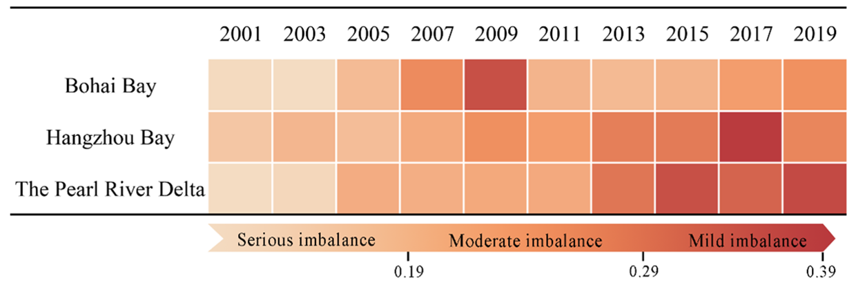 Coupling coordinated level of the three bay areas during 2001–2019. The coupling coordination level in the three bay areas is overall imbalance, but they show a trend of fluctuation improvement. The coordinated development of PRD and HZB in south China is better than that of BHB in north China.