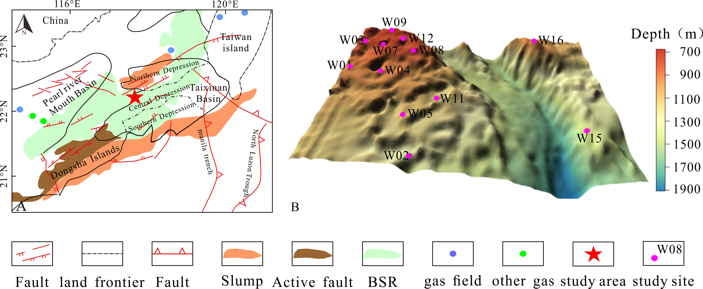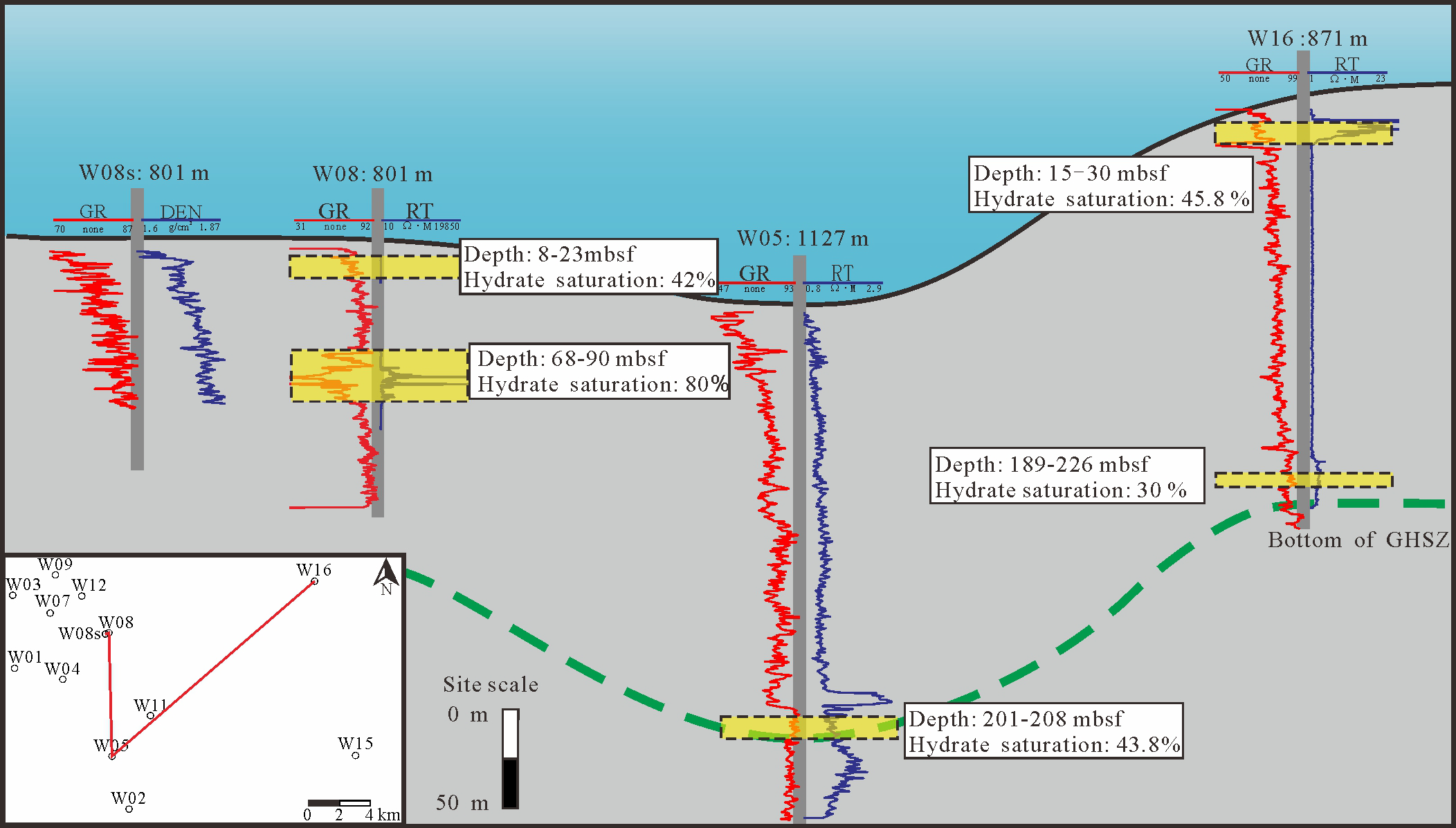 Sites W07, W08, W09 and W16 in the Dongsha region all contain multilayer hydrate development, as shown by drilling (Zhang et al., 2014b), and the formation of multilayer gas hydrate at some sites is also related to the variation of the GHSZ. For example, two hydrate layers were drilled at Site W16, the shallow hydrate layers were distributed 15 m to 30 m below the seafloor, and no obvious BSR was found below the hydrate. Hydrate existed in argillaceous siltstones and sandstones as nodules, and the saturation value were between 32% and 65%. Hydrate is distributed in the deeper layer 189 m to 226 m below the seafloor. Hydrate occurs in mud in dispersive and vein-like forms, and the saturation values are 24% to 36% (Zhang et al., 2014b; Wang, 2016; Zhang et al., 2017). A geochronological analysis of gas hydrate in this area shows that the shallow gas hydrate at Site W16 formed between 0.063 and 0.107 Ma, and the lower gas hydrate formed between 0.78 and 0.357 Ma (Zhang et al., 2017).