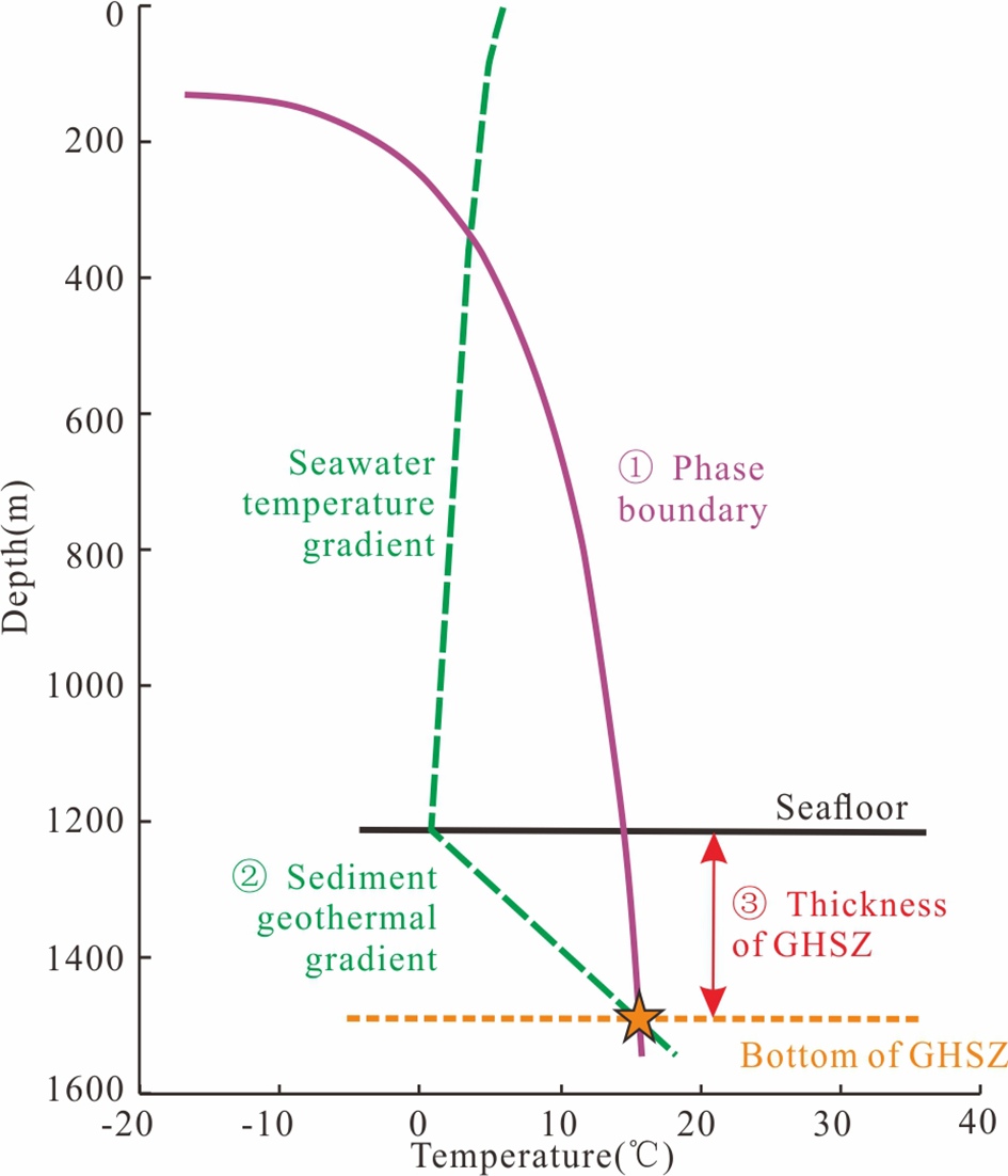 The GHSZ is the range where the three phases of NGH, water and gas reach thermodynamic equilibrium, which is mainly limited by temperature, pressure and salinity (Figure 2) (Kvenvolden, 1993; Rempel and Buffett, 1997). The intersection of the geothermal gradient and temperature−pressure phase equilibrium boundary below the seafloor is the bottom boundary of the GHSZ, the bottom is the top boundary of the GHSZ, and the vertical distance between the top and bottom boundary is the thickness of the GHSZ. Therefore, the thickness of the GHSZ can be calculated by using the temperature and pressure phase balance formula of gas hydrate combined with the geothermal gradient curve (Dickens and Quinby-Hunt, 1994; Bishnoi and Dholabhai, 1999; Sloan and Koh, 2008).