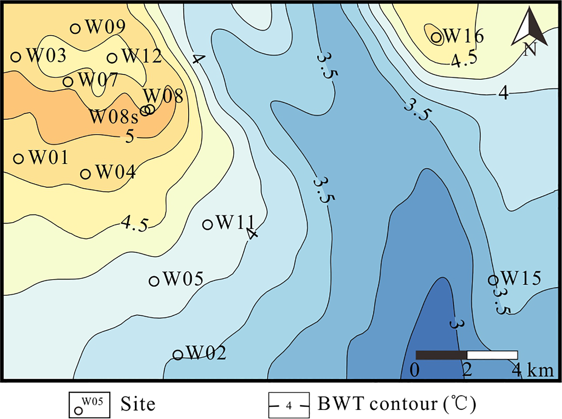 where T is the BWT, in °C; Ti is the sediment temperature at point i, in °C; hi is the vertical distance to the seafloor at point i, in m; and G is the geothermal gradient, in °C/m.