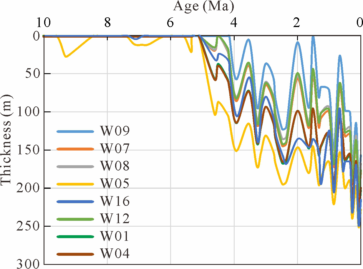 Using the above methods and parameters, the variation processes of the thickness of the GHSZ since 10 Ma in the Dongsha area were calculated, and the results are shown in Figures 5–7.