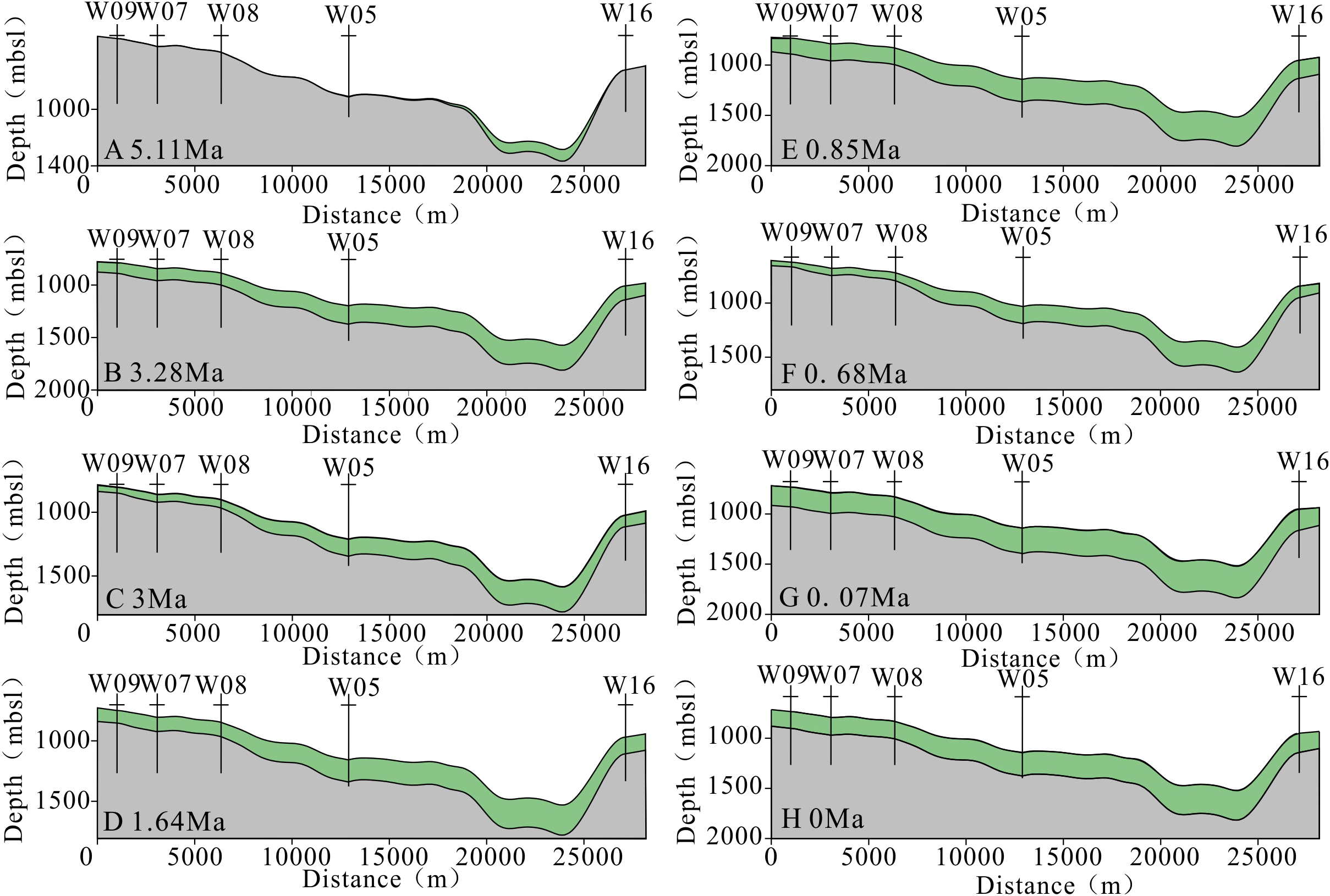 Characteristics of the GHSZ in the 2D profile. (A) 5.11 Ma, (B) 3.28 Ma, (C) 3 Ma, (D) 1.64 Ma, (E) 0.85 Ma, (F) 0.68 Ma, (G) 0.07 Ma, (H) 0 Ma.