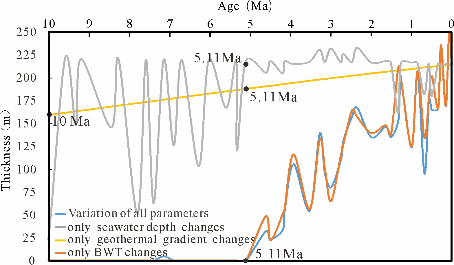 According to the thickness characteristics of the GHSZ at Site W16 (Figure 4), from 5.11 to 0 Ma, the GHSZ thickens from 0.52 m to 214.70 m. As shown in Figure 8, when other conditions remain unchanged, the geothermal gradient decreases from 38.53°C/km at 5.11 Ma to 34.70°C/km at 10 Ma, and the GHSZ thickens by 26.56 m. When other conditions remain unchanged, the depth of seawater decreases from 464.20 m at 5.11 Ma to 885.00 m at 0 Ma, and the thickness of the GHSZ decreases by 3.75 m. When other conditions remain constant, the BWT increases from 12.58 °C at 5.11 Ma to 5.34°C at 0 Ma, and the GHSZ thickens from 0.58 m to 214.70 m. In conclusion, only when the BWT changes is the thickness change of the GHSZ (214.12 m) close to that of the actual GHSZ (214.18 m). The higher BWT is the main reason for the GHSZ thickening to 214.70 m from 5.11 to 0 Ma.