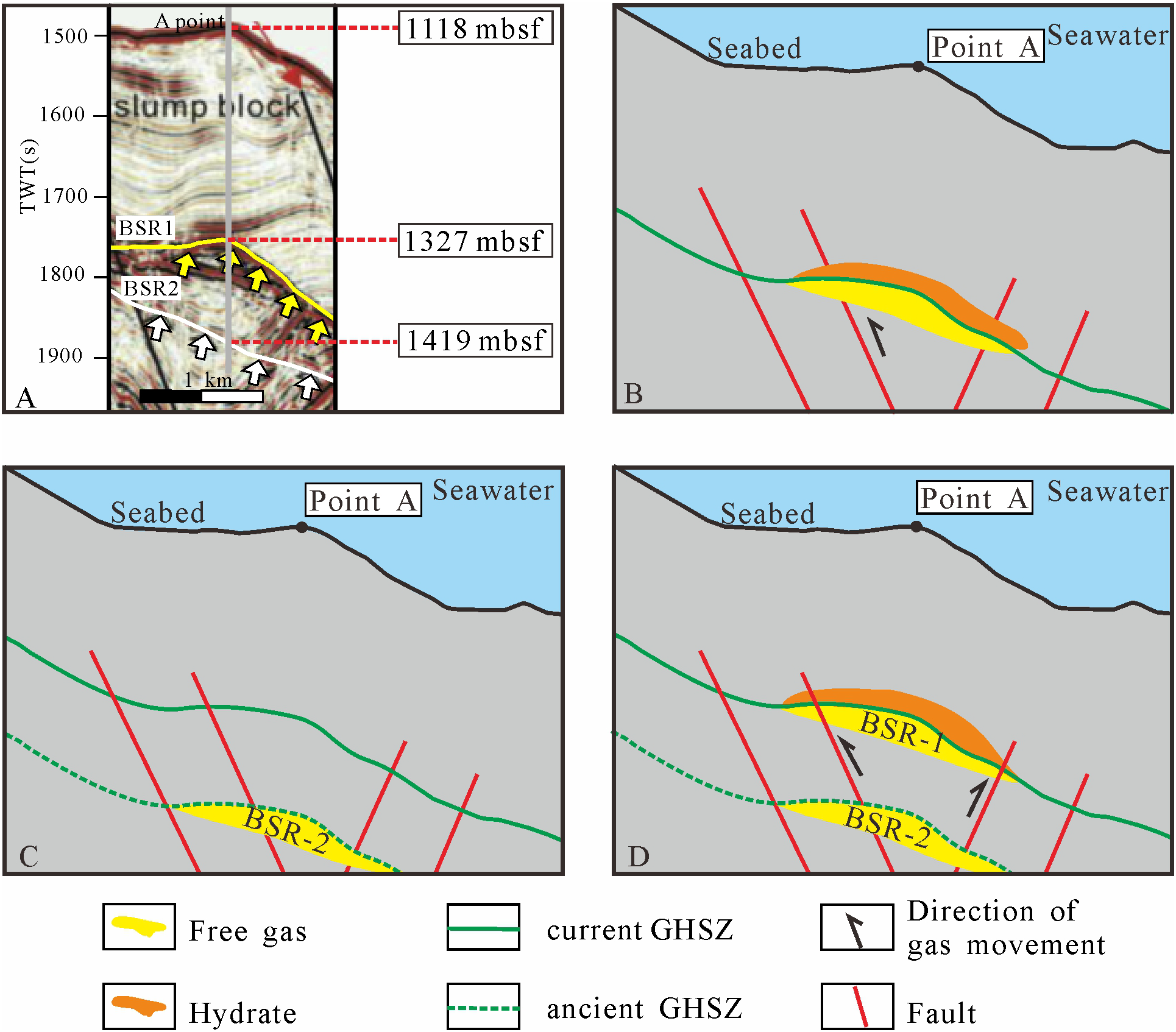 2. Two hydrate dynamic accumulation models related to the variation in the GHSZ in the Dongsha region, northern SCS. The first hydrate accumulation model is a double BSRs model that shows the formation as due to the thickness change in the GHSZ. The thinning of the GHSZ leads to the migration of the early hydrate and BSR out of the GHSZ to form the residual BSR in the lower part, and there is no hydrate development above the BSR. The gas in the late migration to the new GHSZ reaccumulates hydrate and forms a new BSR. The second hydrate accumulation model is a multilayer hydrate model, with single or multiple BSRs due to the general change in the thickness of the GHSZ.