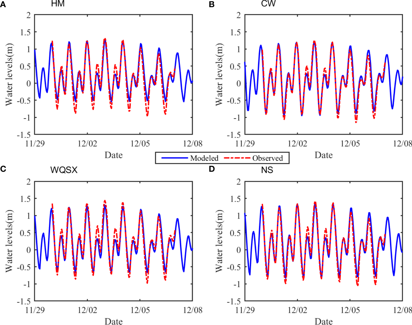 Model Calibration for water levels at tidal gauging station HM (A), CW (B), WQSX (C), and NS (D), where the blue lines represent modeled water levels and the red dashed lines represent the observations.
