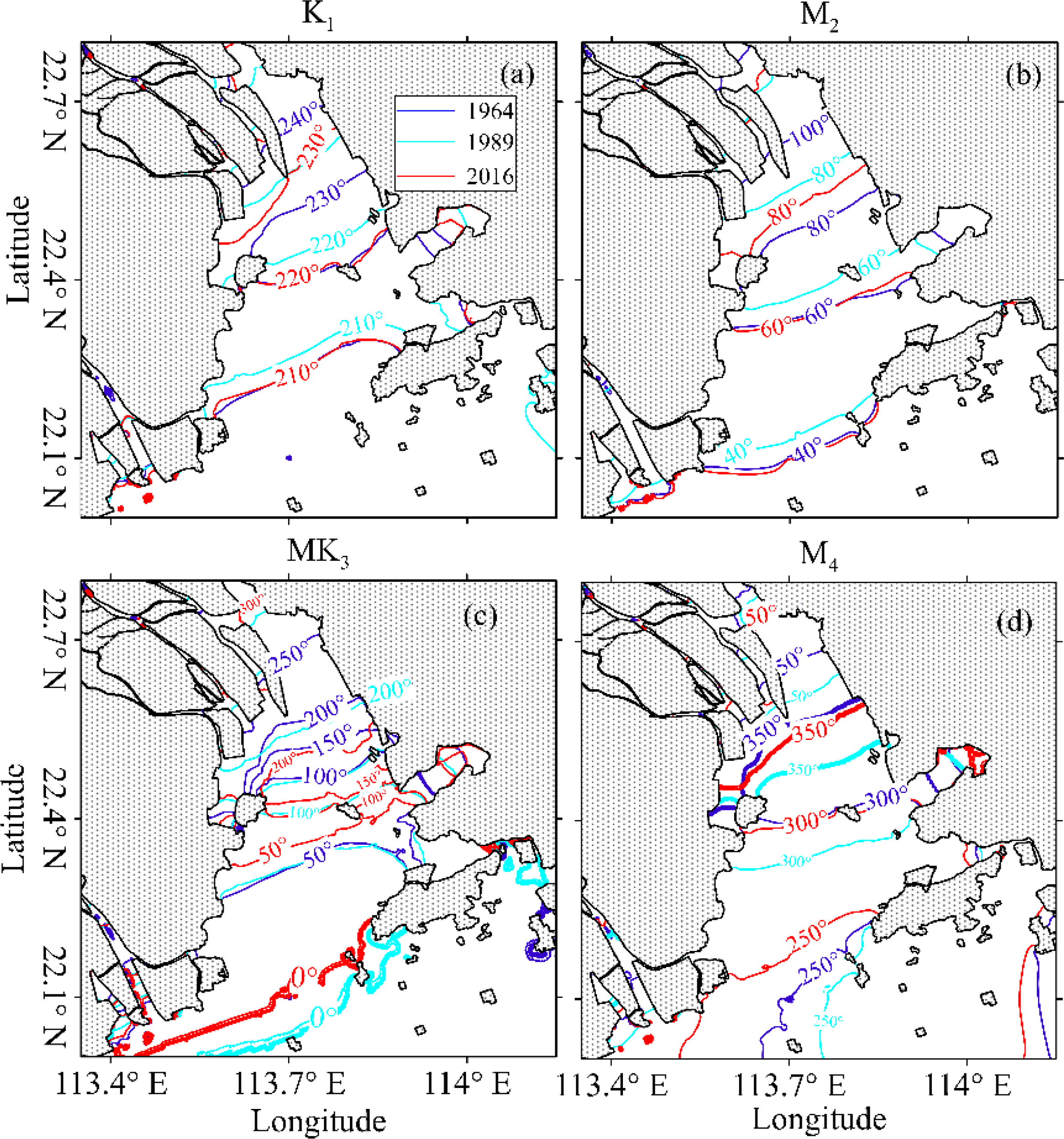 Contour map of K1(A), M2(B), MK3(C), and M4(D) phases. The blue lines represent phase isolines in 1964, the dashed cyan lines represent phase isolines in 1989, and the red lines represent phase isolines in 2016.