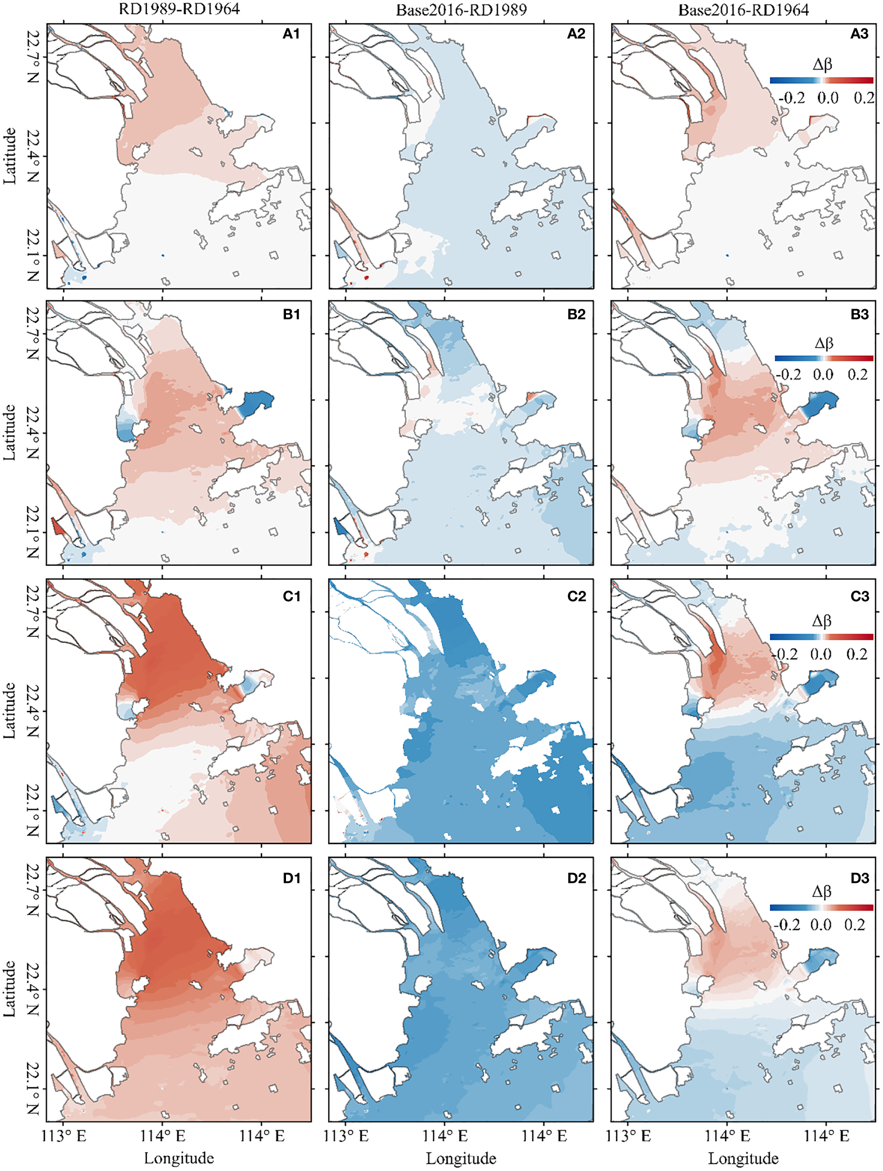 Contour map of the changes in primary contributors of tidal skewness, including βK1/O1/M2(A1–A3), βK1/M2/MK3(B1–B3), βM2/S2/MS4(C1–C3), and βM2/M4(D1–D3); number 1, 2, 3 represent 1964-1989, 1989-2016, and 1964-2016, respectively.