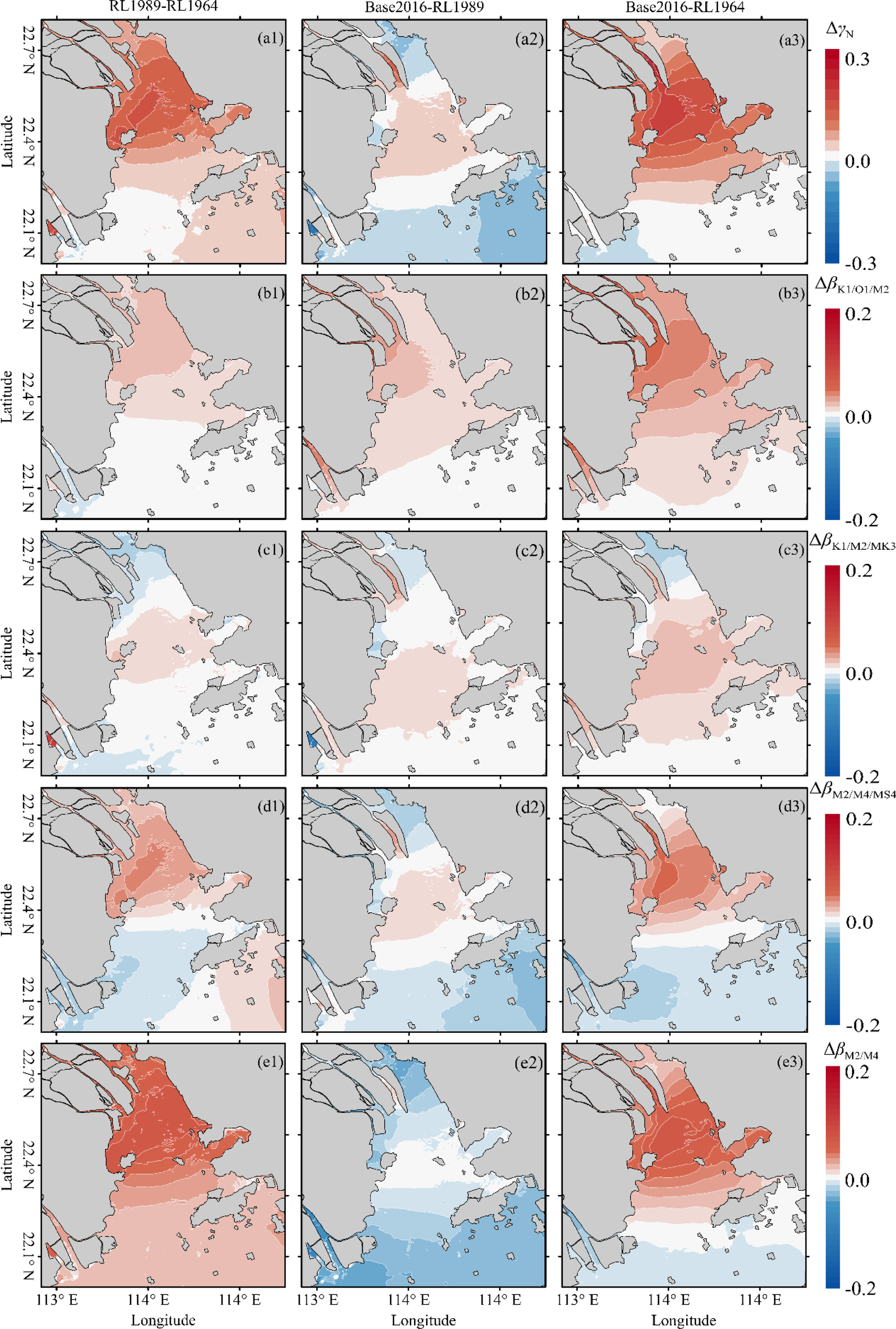 The amplitude differences in tidal constituents between two typical years (1964-1989 and 1989-2016) and the cumulative changes over the study period (1964-2016) were quantified (Figure 5). In 1964-1989 (Figure 5A1), the amplitudes of the K1 tide became larger in the middle of the bay but smaller in the western outlets (Jiaomen, Hongqili, and Hengmen) and outside of the bay. However, this variation pattern changed during– 1989-2016 (Figure 5A2), where the K1 amplitude differences were positive in the upper parts of the LDB and river networks and negative in the middle. The cumulative effect of topographic evolution on the K1 tidal amplitudes is shown in Figure 5A3. The K1 amplitudes increased maximally by 0.03 m in the bay but remained nearly unchanged, specifically at the outer LDB.