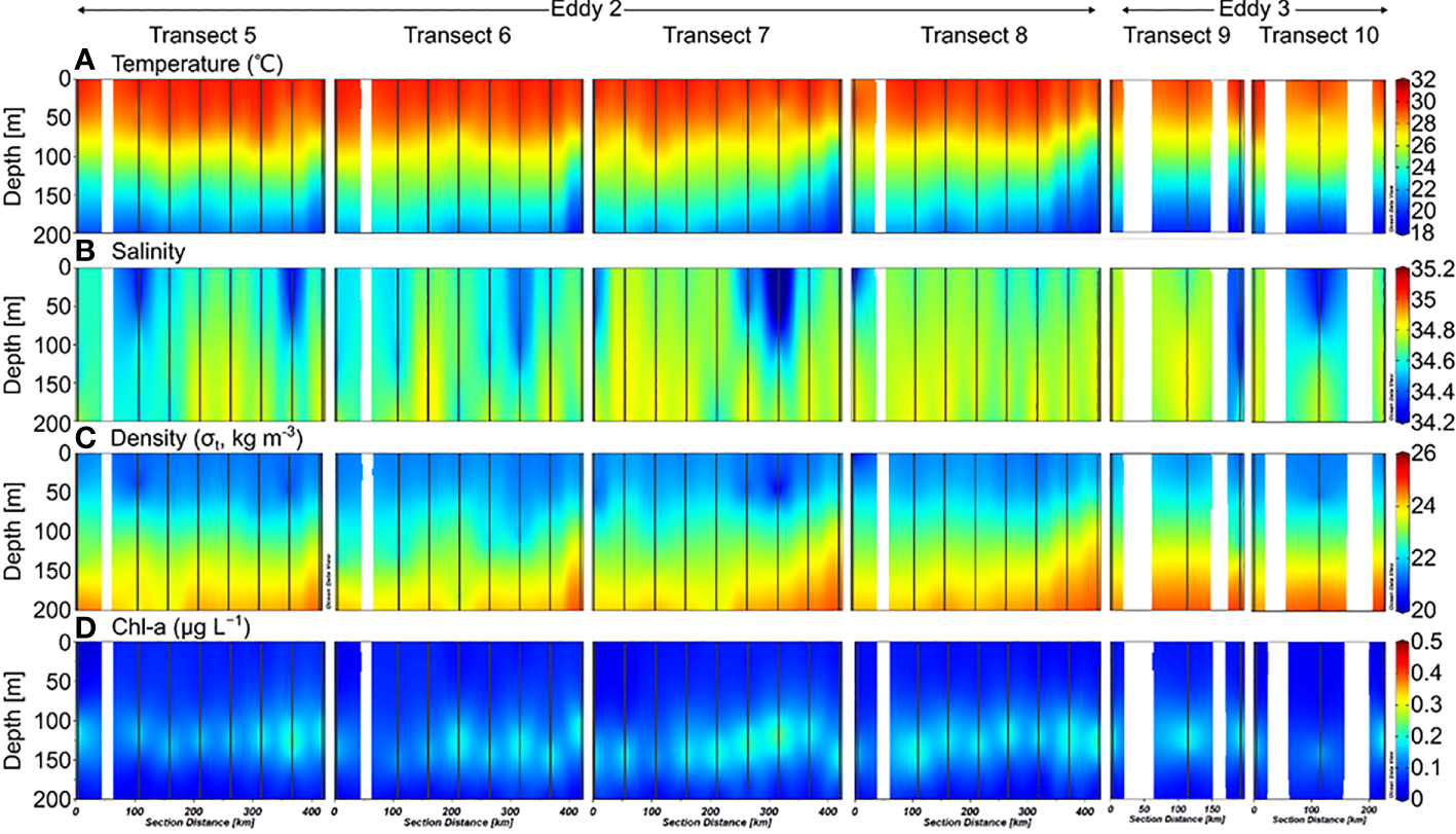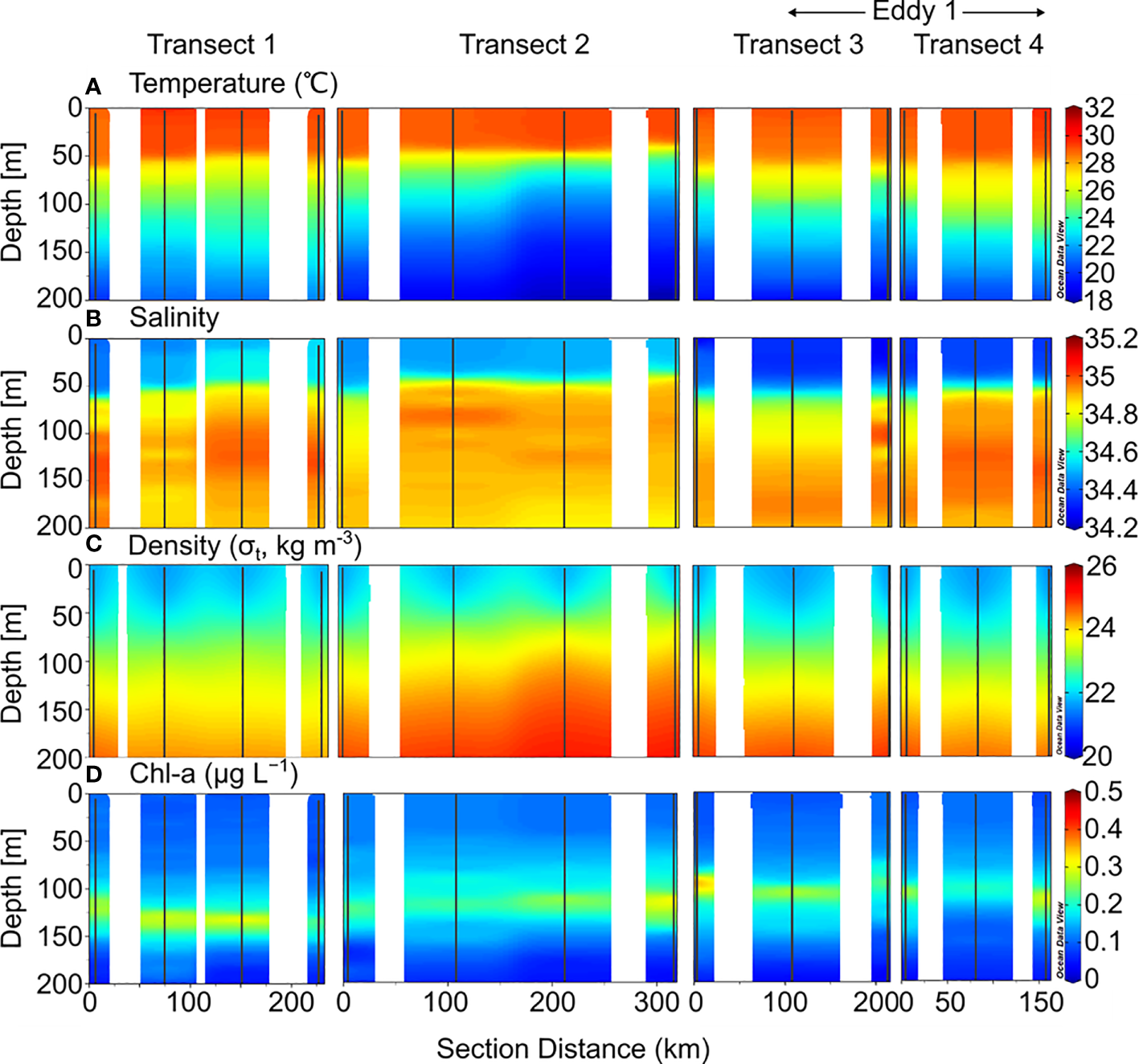 Sectional distributions of (A) temperature, (B) salinity, (C) density, and (D) Chl-a in the upper 200 m layer of the northwest Pacific from August to September 2019.