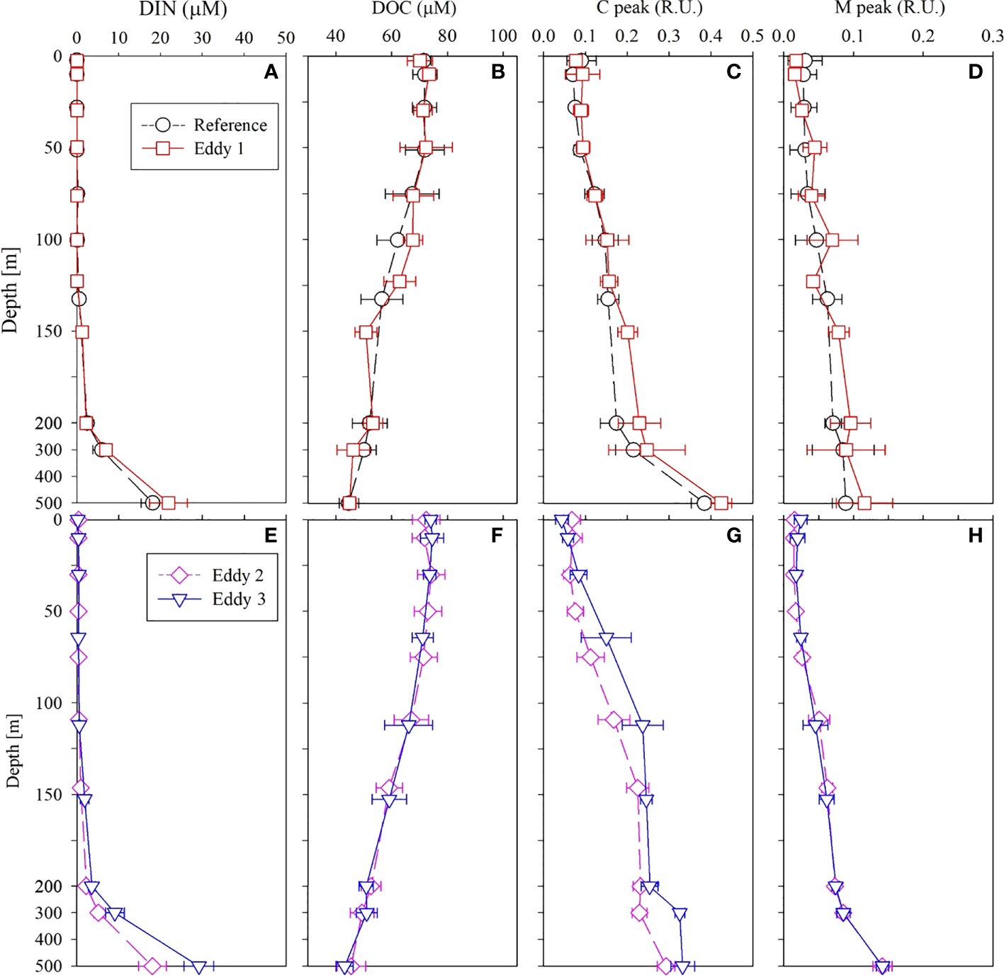 Vertical distributions of (A) DIN, (B) DOC, (C) C peak, and (D) M peak in 2019 and (E) DIN, (F) DOC, (G) C peak, and (H) M peak in 2020 in the upper 500 m layer of the northwest Pacific. The data present as the mean and standard deviations.