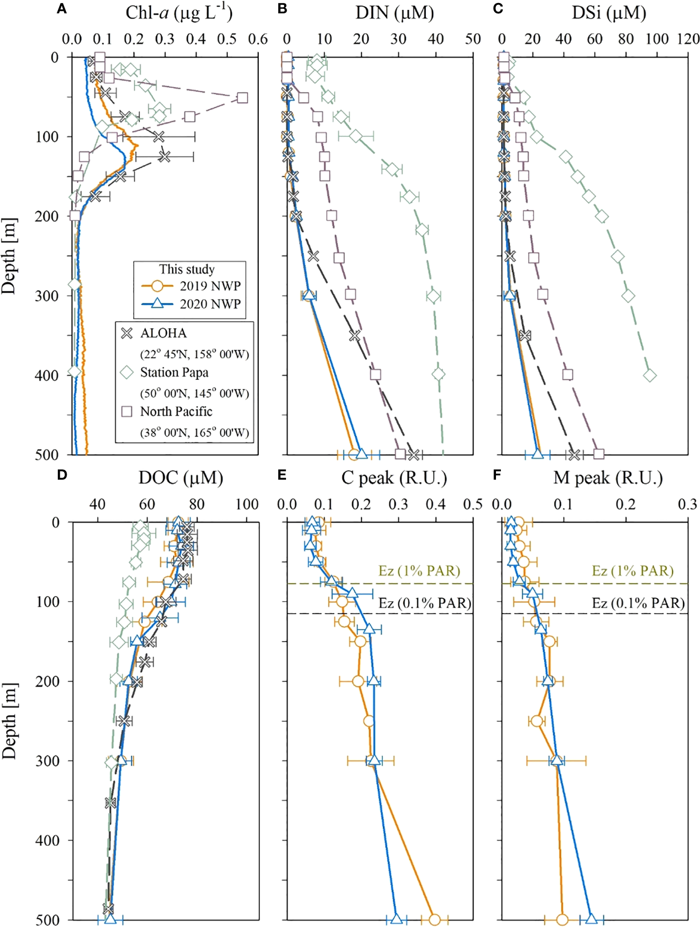 Vertical profiles of (A) Chl-a, (B) DIN, (C) DSi, (D) DOC, (E) C peak, and (F) M peak in the upper 500 m layer in the NWP in September 2019 and 2020. Data are from Buesseler et al. (2020), the Hawaii Times Series, and the Japan Meteorological Agency.