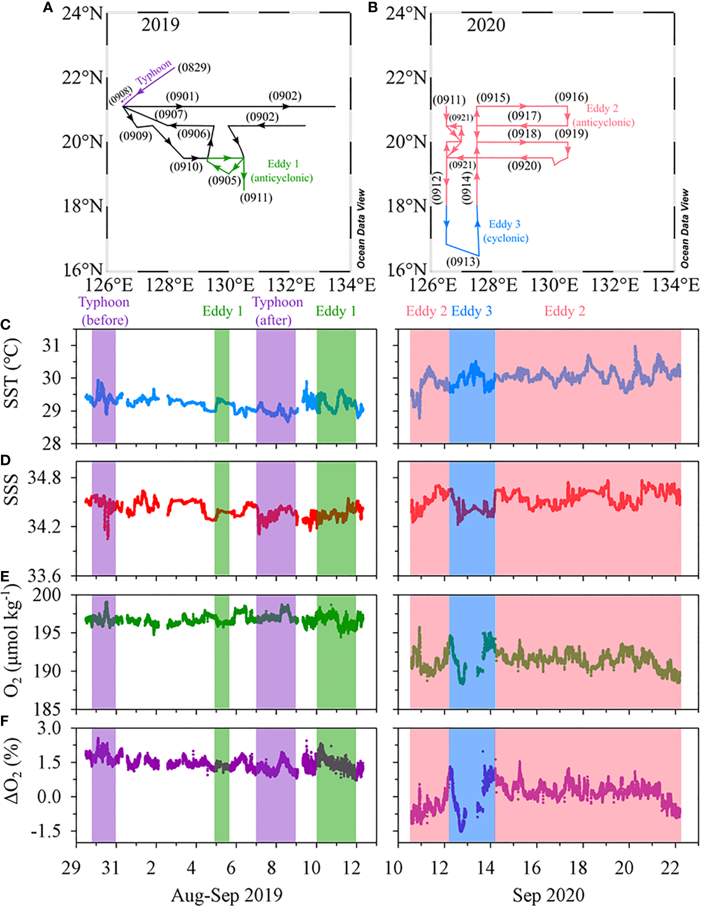 Map showing the cruise tracks in (A) 2019 and (B) 2020. Time series of in situ measurements of (C) temperature, (D) salinity, (E) DO concentrations, and (F) DO saturation anomaly in 2019 (left) and 2020 (right).
