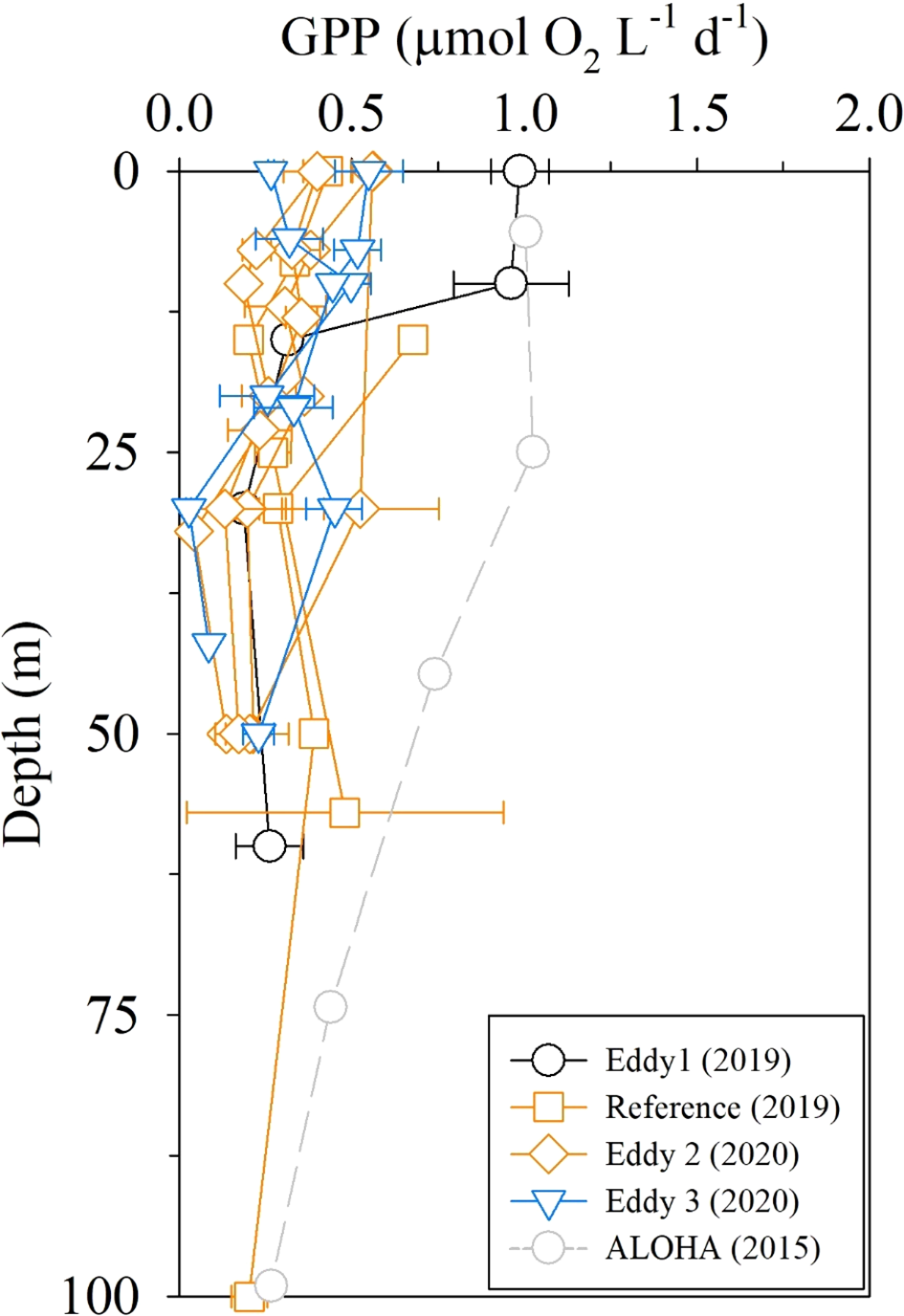 Depth profiles of GPP rates measured using the 18O in vitro method. ALOHA data are from Ferrón et al. (2016).