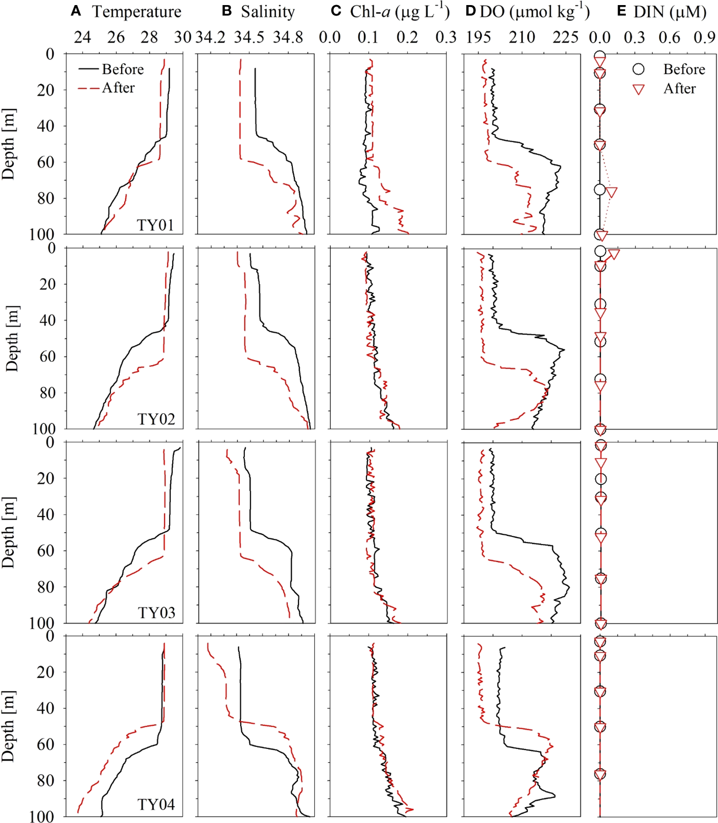 Vertical profiles of (A) temperature, (B) salinity, (C) Chl-a, (D) DO, and (E) DIN in the typhoon region for stations TY01, TY02, TY03, and TY04 in September 2019. Black solid and red dashed lines denote conditions before and after the passing of the typhoon, respectively.