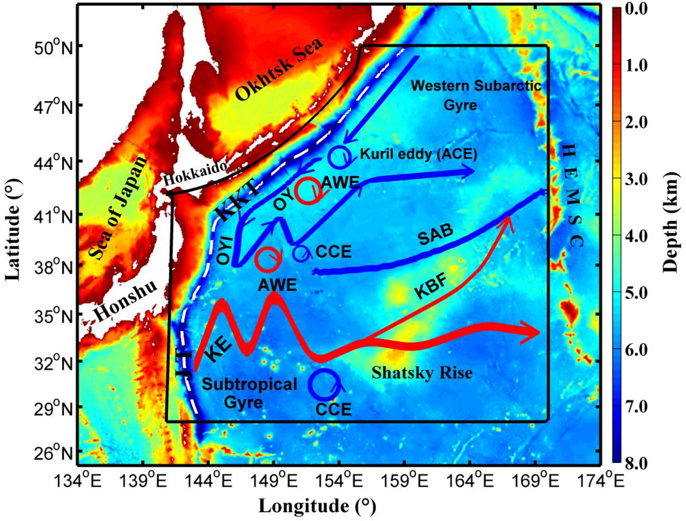 Geography and hydrography of the Kuroshio–Oyashio Extension region (black polygon area). The background color indicates water depth (units: km), and the white dotted line indicates the Japan Trench (JT) and Kuril-Kamchatka Trench (KKT). The symbols “OY”, “OYI”, “KE”, “CCE”, “AWE”, “ACE”, “SAF”, “KBF”, “HEMSC” stand for Oyashio Current, southward intrusion of the Oyashio, Kuroshio Extension, cyclonic cold-core eddy, anticyclonic warm-core eddy, anticyclonic cold-core eddy, Subarctic Front, the Kuroshio Bifurcation Front, and the Hawaii-Emperor Sea mount chain, respectively.