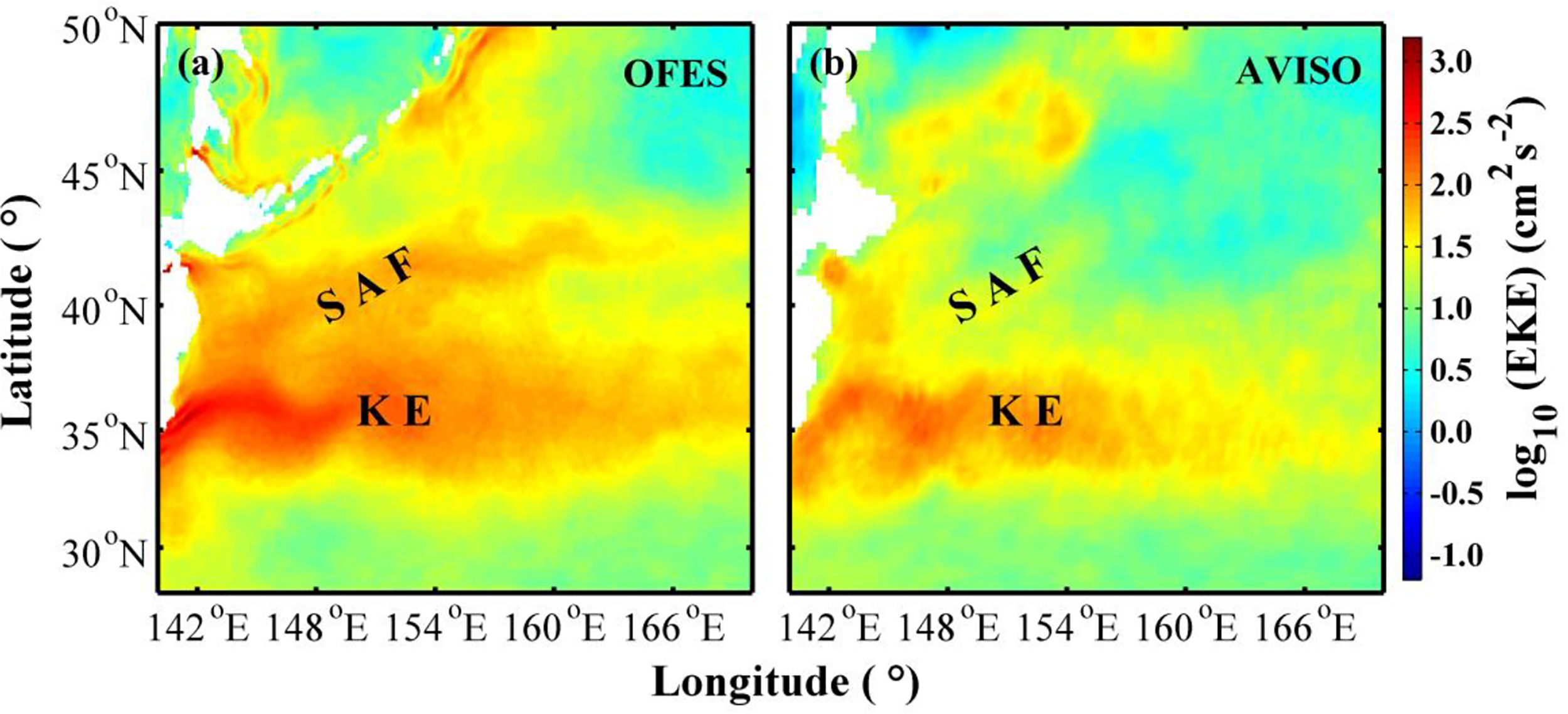 Distribution of sea surface eddy kinetic energy calculated from (A) OFES and (B) AVISO data. Shading indicates the value of eddy kinetic energy (units: cm2/s2). The symbol “KE” and “SAF” represent the Kuroshio Extension and Subarctic Front, respectively. Note that the eddy kinetic energy is plotted with log base 10.