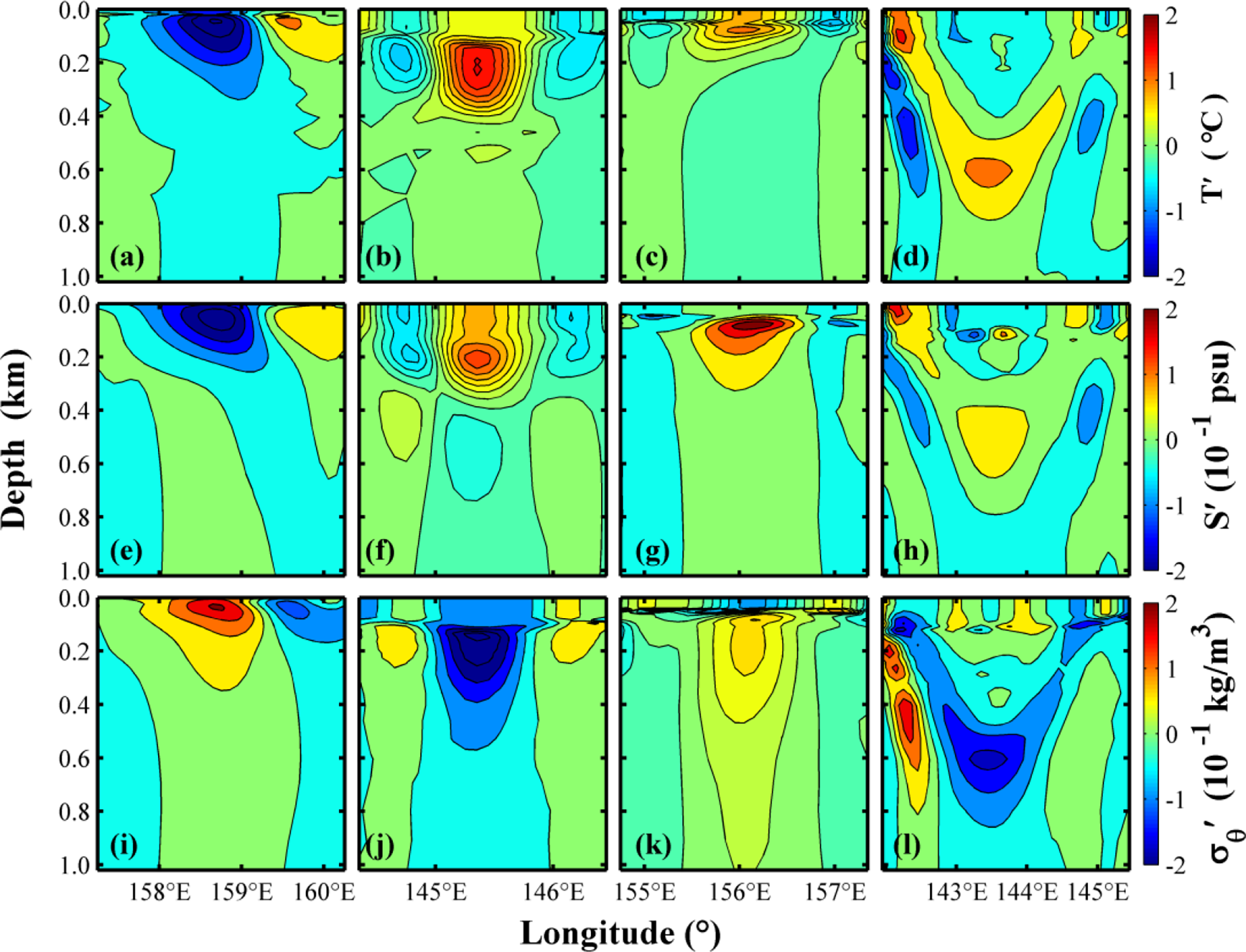 The CWE case shown in Figure 3C appeared on November 20, 2009. The center of the CWE is located at (156.05°E, 46.65°N), the average radius is 62.7 km, and the vertical penetration depth is 1,702.4 m. The average T’ inside this eddy is 0.40°C, and the maximum T’ is 0.92°C. The ACE case appeared on December 12, 2010 (Figure 3D). The ACE’s center is located at (143.45°E, 39.25°N), the average radius is 67.5 km, and the vertical penetration depth is 604.5 m. The average and the maximum T’ inside the ACE are –0.24°C and –0.59°C, respectively. The average radius of these four eddy cases is about O(60 km), but their vertical penetration depth is significantly different.