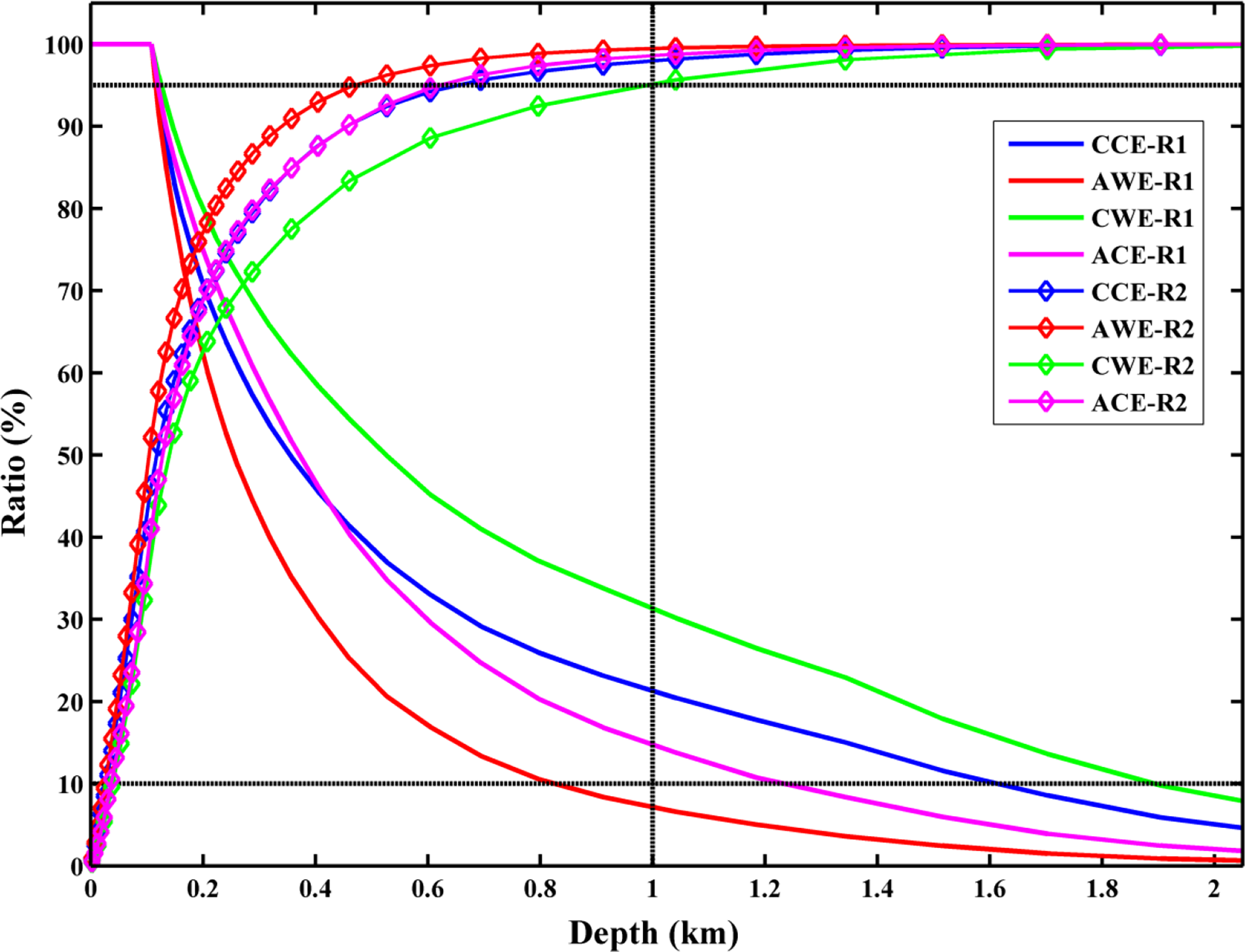 Figure 6 shows the vertical distribution of R1(z) . Within the upper 100 m, R1 is always equal to one due to the additional restriction that the vertical penetration depth of the eddy is at least 100 m. When the water depth reaches 1,000 m, the corresponding R1 of CCEs, AWEs, CWEs, and ACEs is 36.03, 11.92, 0.32, and 0.24%. At 2,000 m, R1 for CCEs, AWEs, CWEs, and ACEs is 9.16, 1.31, 2.91, and 0.70%, respectively. Here, the number of eddies decreases rapidly with increasing depth. The downward trend of R1 is another representation of the vertical penetration depth of the eddy (please refer to Figure 7). Therefore, it is necessary to consider at least 2,000 m to discuss the impact of eddies when analyzing the vertical distribution of eddy numbers, especially for normal eddies.
