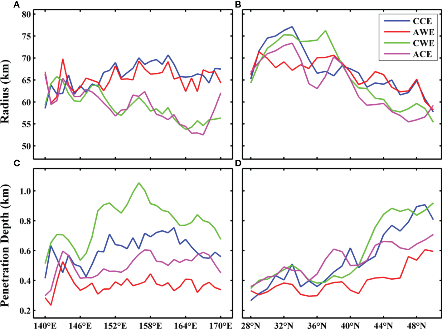 Figure 7 shows the variation of the average eddy radius (Figures 7A, B) and vertical penetration depth (Figures 7C, D) of the three-dimensional eddy with longitude (Figures 7A, C) and latitude (Figures 7B, D). Figures 7A, B show that the average radius of CCEs and AWEs is 65.96 ± 2.86 and 65.28 ± 2.38 km, respectively, with little difference between them. The average eddy radius of both CCEs and AWEs tends to increase gradually from the coast to the open ocean (Figure 7A). On the contrary, the average eddy radius of CWEs is 59.11 ± 3.98 km, and that of ACEs is 58.88 ± 4.88 km.