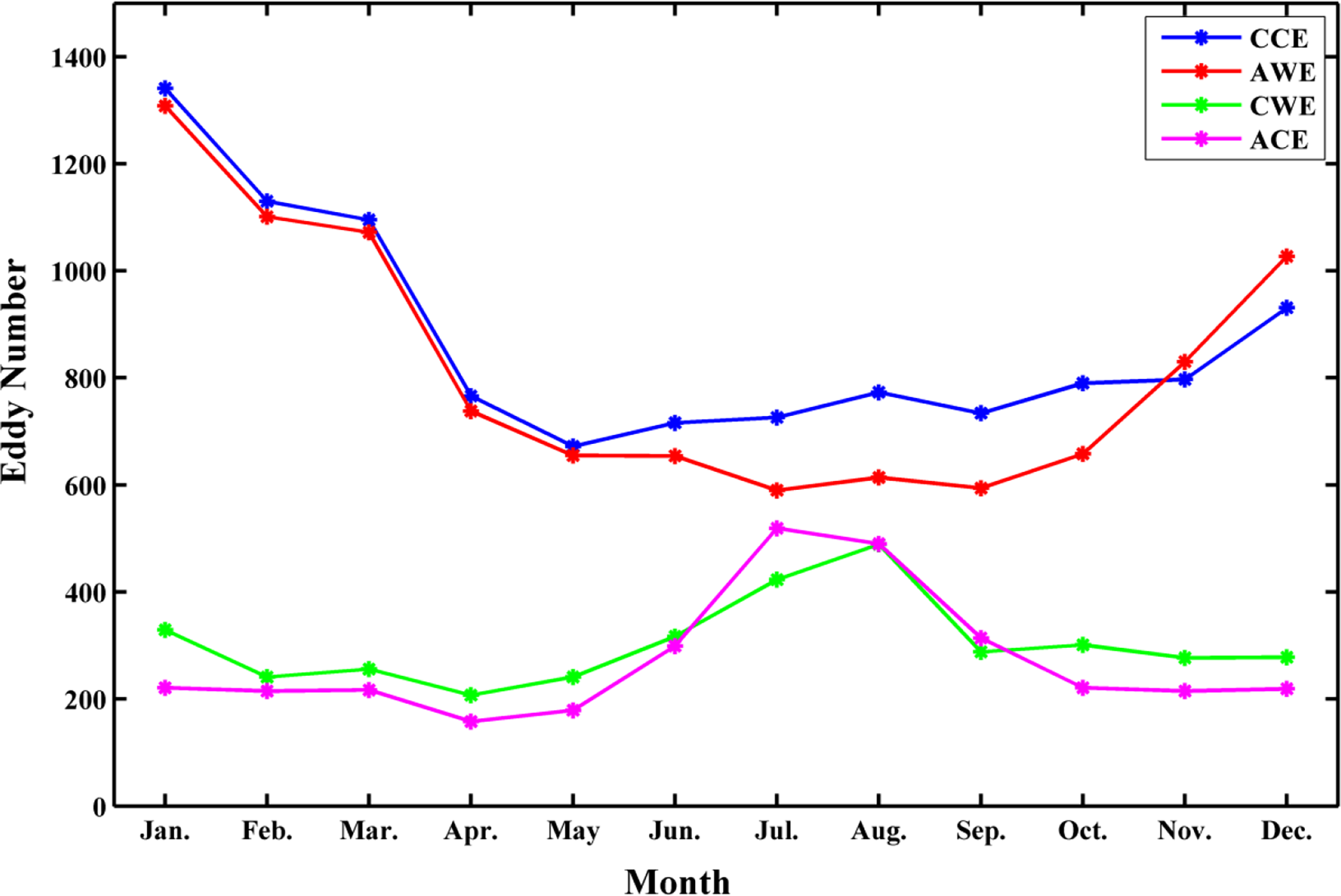 Figure 8 shows the seasonal distribution of the number of four types of eddies. The variation trend of normal eddies is consistent as a whole, i.e., there is no noticeable difference in the number of CCEs and AWEs. Both are characterized by a large number in winter months (December – February) and a small number in summer months (June – August). The largest number occurred in January, with 1,341 CCEs and 1,308 AWEs. The minimum eddy number appears in May (672) for CCEs and in July (590) for AWEs.