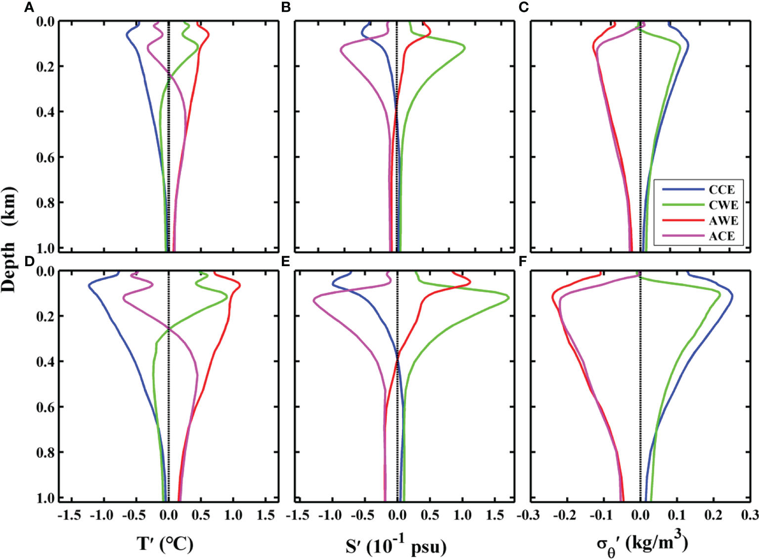 Previous studies pointed out that mesoscale eddies can cause vertical anomalies of various marine elements (Gaube et al., 2019). Figure 9 shows the vertical distribution of temperature, salinity, and potential density anomalies modulated by the four types of eddies. Figures 9A–C show the result within a one-time eddy radius, and Figures 9D–F show the situation within 0.5 times eddy radius. The vertical changes of T’ modulated by normal eddies are consistent (Figures 9A, D). CCEs induce a negative T’ (Figure 9A). For the results within a one-time the radius (0.5 times the radius), the maximum value of CCEs-modulated T’ is -0.78°C (-1.48°C), which occurs at 63.23 m (120.77 m). Accordingly, AWEs induce a positive T’ (Figure 9A). For the result within a one-time radius (0.5 times radius), the maximum T’ is 0.74°C (1.32°C) at 63.23 m (63.23 m).