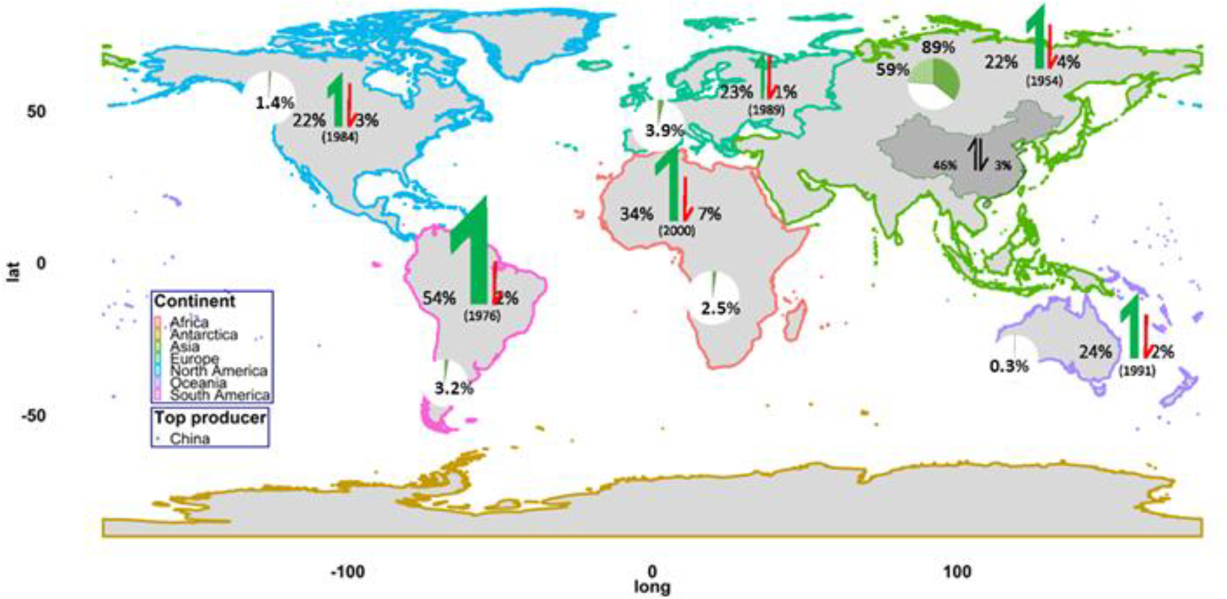 Figure 2 Global aquaculture production and growth rates. Pie charts show the global aquaculture production (%) by continents from 2014 to 2018. Asian pie chart also illustrates the percentage of contribution from the world’s largest’ producer (China). Green and red arrows indicate the five year-on-year moving average growth rate (%) before the peak growth rate and five-year moving average between 2014 and 2018, respectively.