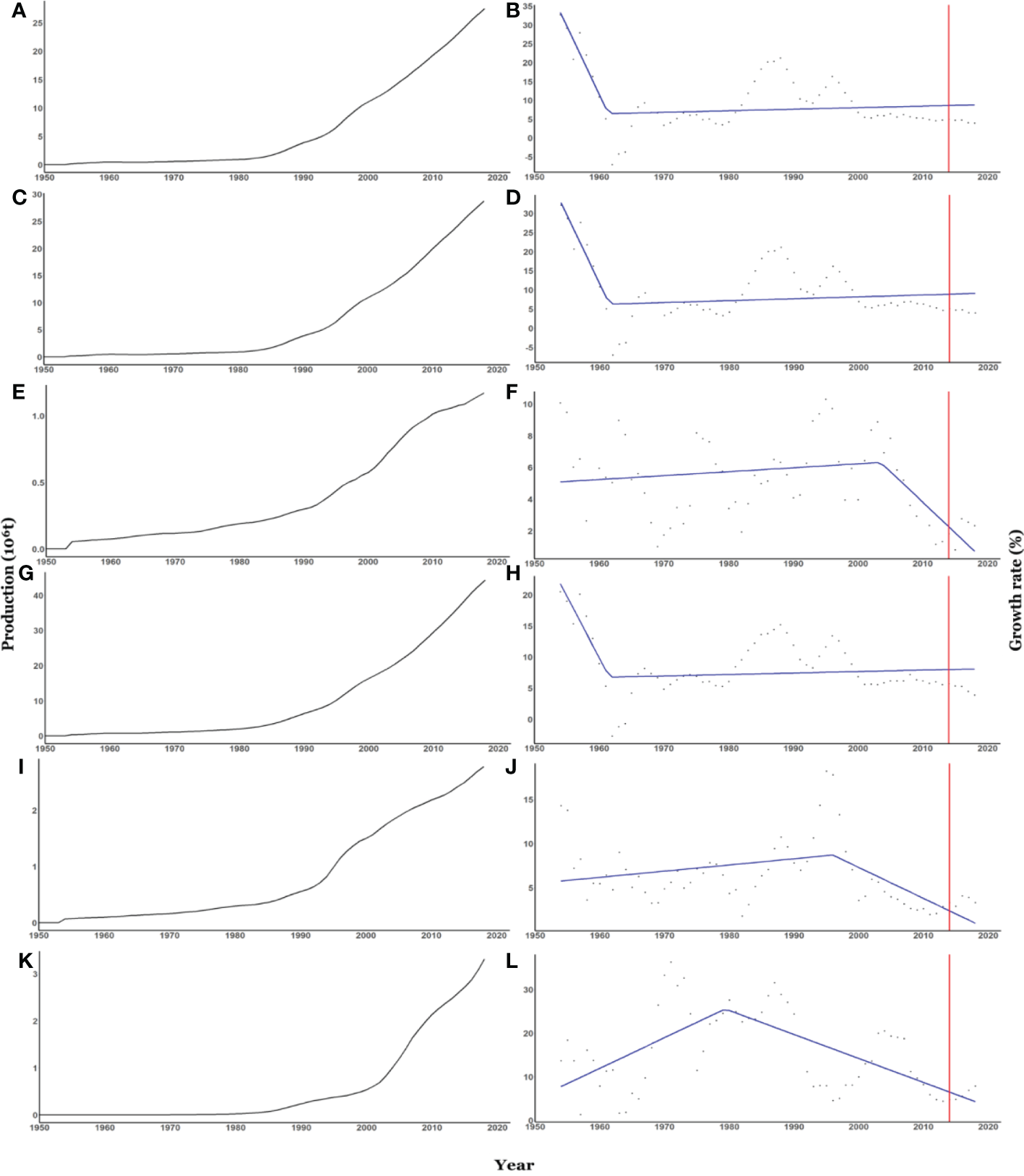 Figure 3 Total farmed species production and growth rates. Figures (A, B) illustrates the top ten farmed species; (C, D) the top ten Fed farmed species; (E, F) the top ten Non-fed farmed species; (G, H) finfish farmed species; (I, J) Bivalves farmed species; (K, L) Invertebrates farmed species). Total production is calculated from 1950-2018, and the growth rate is quantified as five year-on-year moving average from the peak growth production to 2018. The red line highlights the trends for the last five years (2012-2018). The five year-on-year moving average trends are (B) slope1 = -3.67, slope 2 = 0.05;, R2 = 0.5; (D) slope1= -3.55, slope2 = 0.05, R2 = 0.5; (F) slope1 = 0.02, slope2 = -0.39, R2 = 0.27; (H) slope1 = -3.30, slope2 = 0.03, R2 = 0.52; (J) slope1 = -3.69, slope2 = -0.02, R2 = 0.23; (L) slope1 = 0.61, slope2=-0.6, R2 = 0.42. Data source: Food and Agriculture Organisation (FAO).