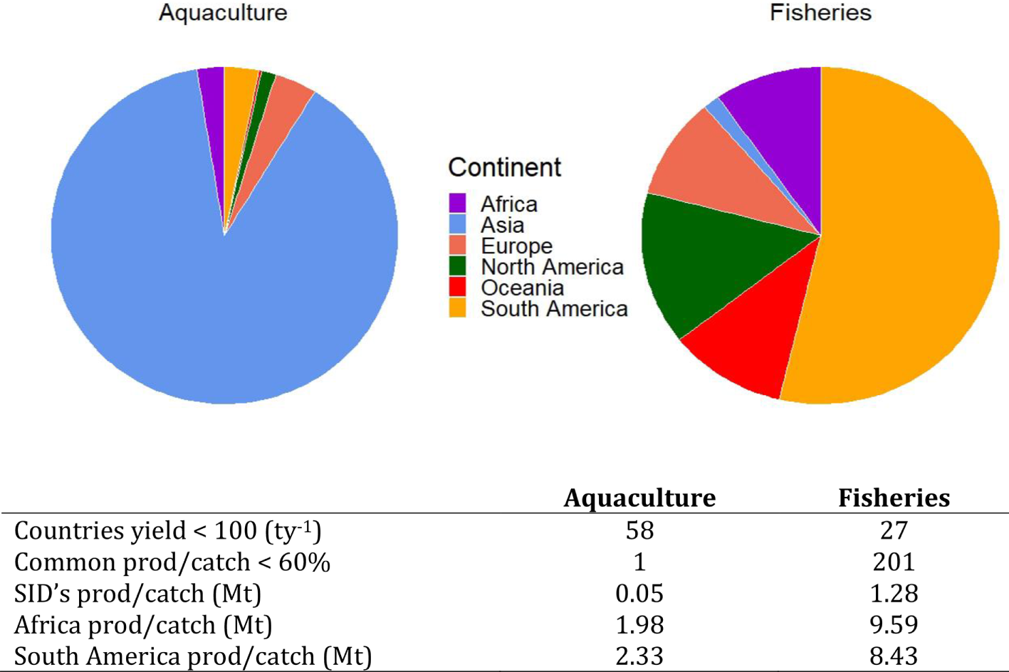 We analyze the global distribution of aquaculture production by country and continent and compare and contrast this with wild marine and freshwater species caught by country and continent to reveal how current aquaculture production is skewed relative to wild catch, and its socio-economic implications.