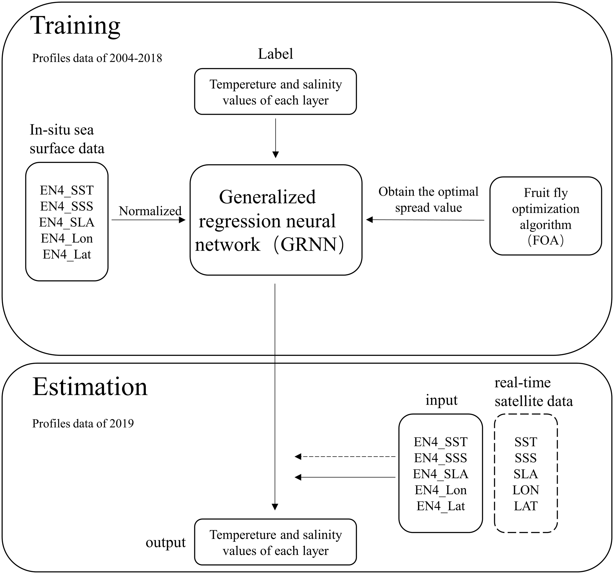 Step 1: Sample data preprocessing. The sample data included satellite altimeter data and in-situ EN4.2.1 T/S profiles. The spatial range of the selected sample data was [19°N-27°N, 122°E-130°E], and the time span was from 2004 to 2019. The sample data from 2004 to 2018 was used as the training set of the reconstruction model, and the sample data in 2019 was utilized as the test set. The data input to the FOAGRNN model included sea surface data (EN4_SST, EN4_SSS, EN4_SLA) and location data (EN4_Lon, EN4_Lat). The uppermost temperature and salinity values of the in-situ EN4.2.1 T/S profiles were employed as the input value of EN4_SST and EN4_SSS, and EN4_SLA was obtained by interpolating satellite altimeter data to the location (EN4_Lon, EN4_Lat). Before training the reconstruction model, the input data was first normalized in the range of 0-1, and the output data were subsurface temperature or salinity values.