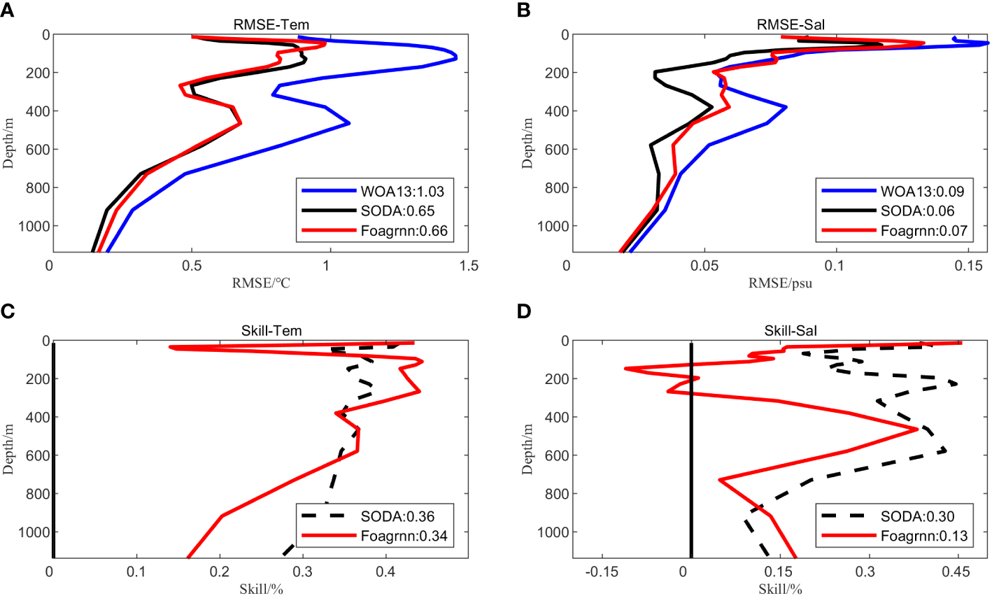 To test the effectiveness of the synthetic model, the root mean square errors (RMSEs) of the 2019 synthetic T/S profiles, SODA3.4.2 reanalysis products, and WOA13 climatology data were calculated separately relative to the EN4.2.1 T/S profiles. The following equation was utilized to calculate the skill score of the synthetic profiles and SODA3.4.2 reanalysis product relative to the WOA13 climatology data (Zhu et al., 2022).