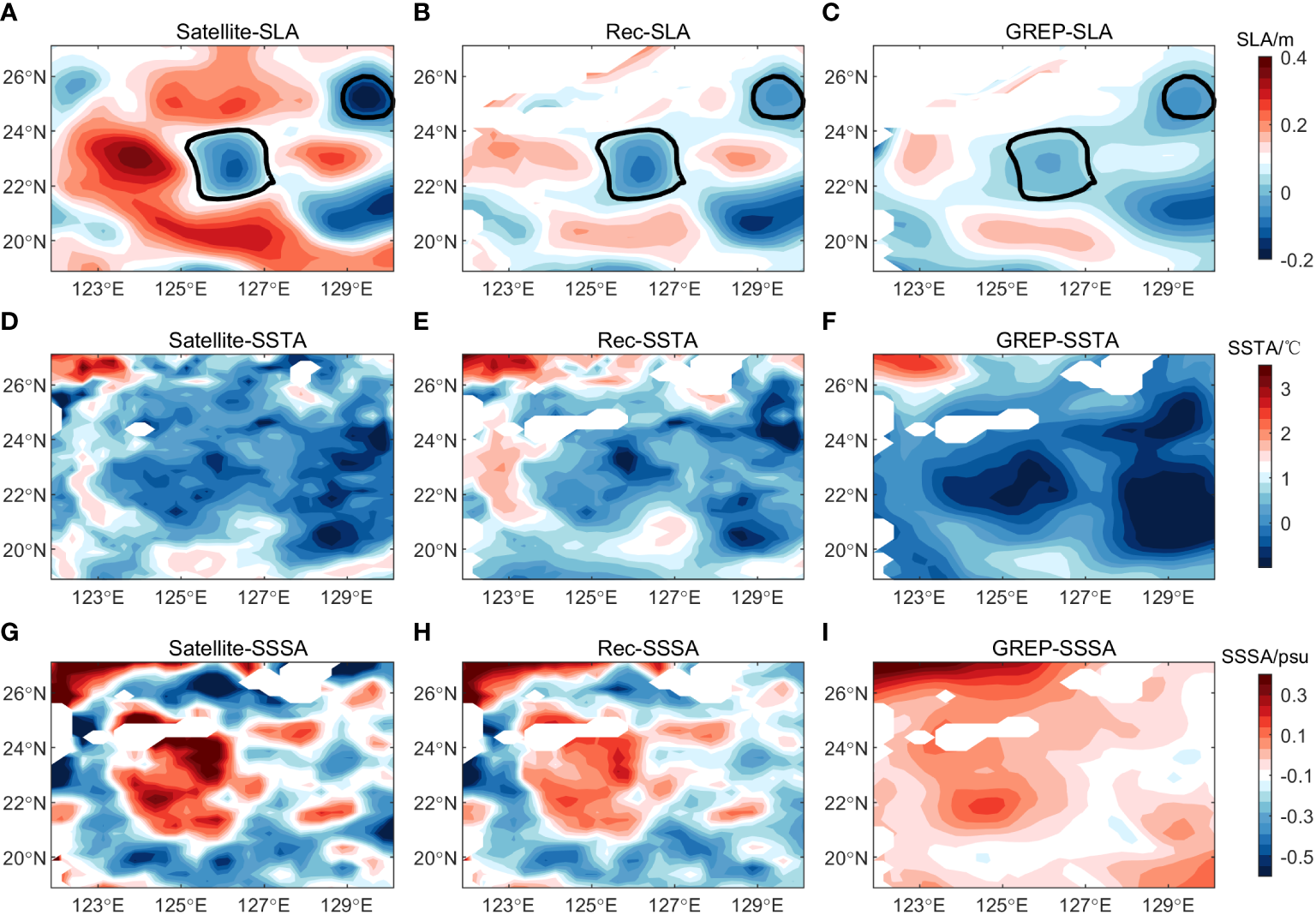 The distribution of the anomaly fields of sea surface level, temperature and salinity from satellite, synthetic fields and GREP reanalysis data on May 13, 2019. (A, D, G) the SLA, SSTA, and SSSA of the satellite observations, (B, E, H) the SLA, SSTA, and SSSA of the synthetic fields, (C, F, I) the SLA, SSTA, and SSSA of the GREP reanalysis product.
