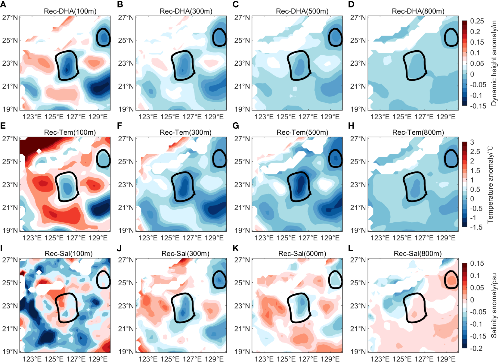 The distribution of the anomaly fields of dynamic height, temperature and salinity from the synthetic fields and on May 13, 2019. From left to right: 100m, 300m, 500m, and 800m. (A–D) the dynamic height anomaly fields of the synthetic fields, (E–H) the temperature anomaly fields of the synthetic fields, (I–L) the salinity anomaly fields of the synthetic fields. The circles in the figure are mesoscale eddies identified by satellite SLA.