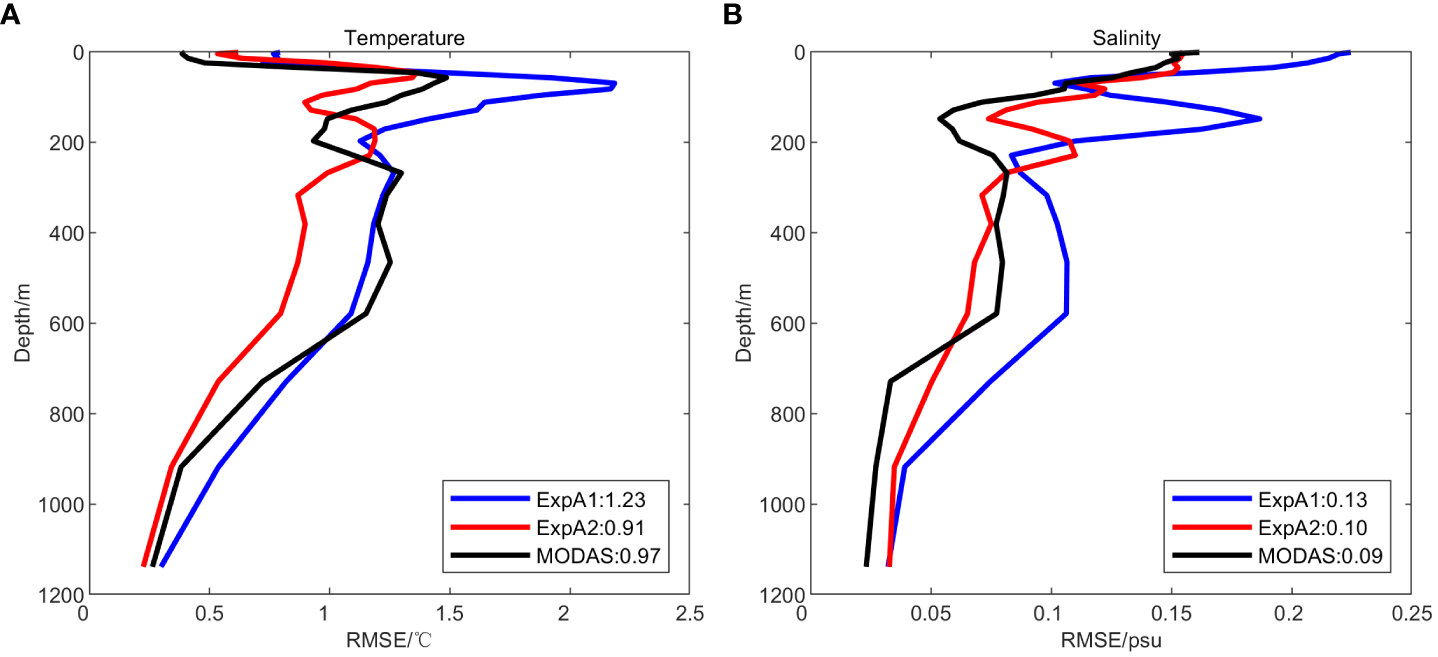 In order to make the RMSE statistically significant, we selected a relatively large area for the assimilation experiment. The RMSEs of the assimilation experiment results of each case relative to the EN4.2.1 in-situ T/S profiles are exhibited in Figure 7. In terms of temperature, ExpA1 has an error of more than 2°C at the thermocline, while ExpA2 has a reduced error at the 100-1100m depth layer. Compared to MODAS, ExpA2 shows higher accuracy at the thermocline and 300-800 m. The depth means of RMSE show that ExpA2 improves the simulation accuracy by 6.2% and 26.0% compared to MODAS and ExpA1, respectively (Figure 7A). From the perspective of salinity, compare with ExpA1, the experiment results of synthetic profiles not only reduce the error at the thermocline, but also have higher simulation accuracy at other depths with improvements in the simulation accuracy by 23.1%. The depth means of RMSE for ExpA2 and MODAS are basically equal (0.10 and 0.09, respectively), which shows that their simulation accuracy is comparable, and it may be related to both assimilating synthetic salinity profiles (Figure 7B).