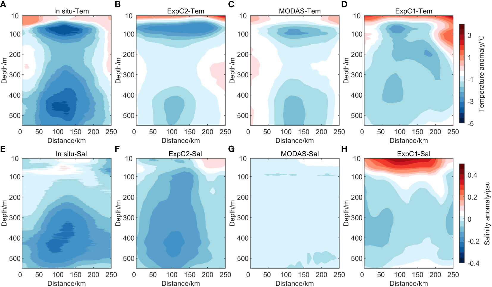 The section where the red dots in Figure 10 are located was taken as the research section. Figures 11A–D reveal the temperature anomaly sections of the in-situ survey data, ExpC2, MODAS data, and ExpC1, respectively. Taking the depth of 200 m as the dividing line, an obvious dual-core structure can be observed in the in-situ temperature anomaly section structure. Compared with the assimilation results of ExpC1, both ExpC2 and MODAS data simulated a dual-core structure, but the strength of the cold eddy structure is not in line with the actual measurement. From the perspective of salinity anomaly sections, we can see in Figures 11E–H that there is a low-salinity center near 400 m in the in-situ salinity anomaly section. The salinity anomaly section structure of ExpC1 did not simulate a single-core structure in the deep layer, and the salinity anomaly value of ExpC1 near the sea surface was much larger than that of the in-situ survey data. The cold eddy structure could not be simulated by MODAS data, and the salinity anomalies at almost all depths were near 0 psu. This indicated that the salinity field of MODAS data was not much different from the WOA13 salinity background field. Differently, ExpC2 simulated an obvious single-core structure, but the depth range covered by the structure was larger than that by the in-situ salinity anomaly section.